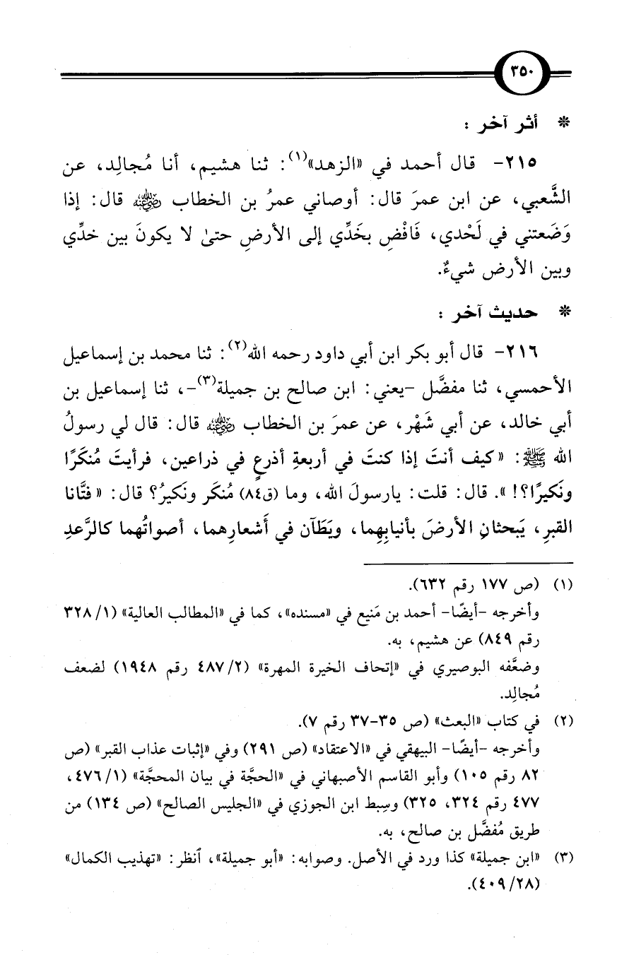 (215) قال أحمد في «الزهد» (¬1): ثنا هشيم، أنا مُجالِد، عن الشَّعبي، عن ابن عمرَ قال: أوصاني عمرُ بن الخطاب -رضي الله عنه- قال: إذا وَضَعتني في لَحْدي، فَافْضِ بخَدِّي إلى الأرضِ حتى لا يكونَ بين خدِّي وبين الأرض شيءٌ.