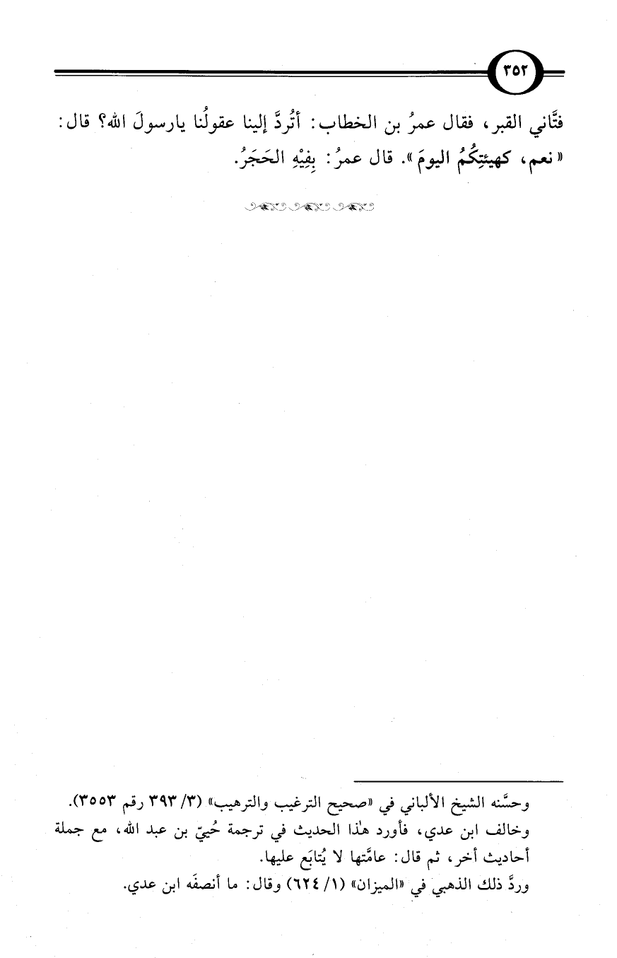 فتَّاني القبر، فقال عمرُ بن الخطاب: أتُردَّ إلينا عقولُنا يارسولَ الله؟ قال: «نعم، كهيئتِكُمُ اليومَ». قال عمرُ: بِفِيْهِ الحَجَرُ.
