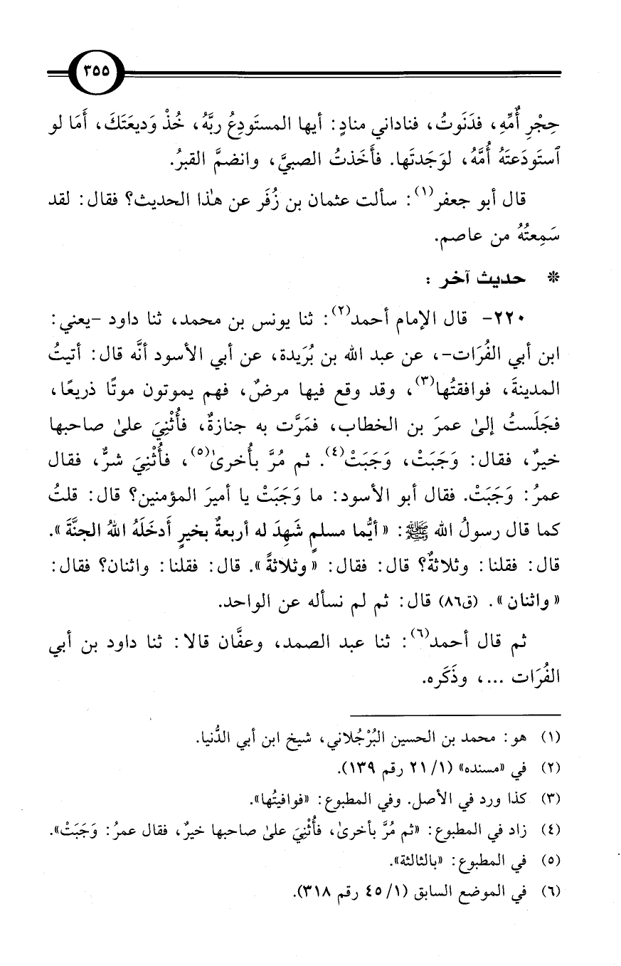 (220) قال الإمام أحمد (¬3): ثنا يونس بن محمد، ثنا داود -يعني: ابن أبي الفُرَات-، عن عبد الله بن بُرَيدة، عن أبي الأسود أنَّه قال: أتيتُ المدينةَ، فوافقتُها (¬4)، وقد وقع فيها مرضٌ، فهم يموتون موتًا ذريعًا، فجَلَستُ إلى عمرَ بن الخطاب، فمَرَّت به جنازةٌ، فأُثْنِيَ على صاحبها خيرٌ، فقال: وَجَبَتْ، وَجَبَتْ (¬5). ثم مُرَّ بأُخرى (¬6)، فأُثْنِيَ شرٌّ، فقال عمرُ: وَجَبَتْ. فقال أبو الأسود: ما وَجَبَتْ يا أميرَ المؤمنين؟ قال: قلتُ كما قال رسولُ الله صلى الله عليه وسلم: «أيُّما مسلمٍ شَهِدَ له أربعةٌ بخيرٍ أَدخَلَهُ اللهُ الجنَّةَ». قال: فقلنا: وثلاثةٌ؟ قال: فقال: «وثلاثةً». قال: فقلنا: واثنان؟ فقال: «واثنان». / (ق 86) قال: ثم لم نسأله عن الواحد.