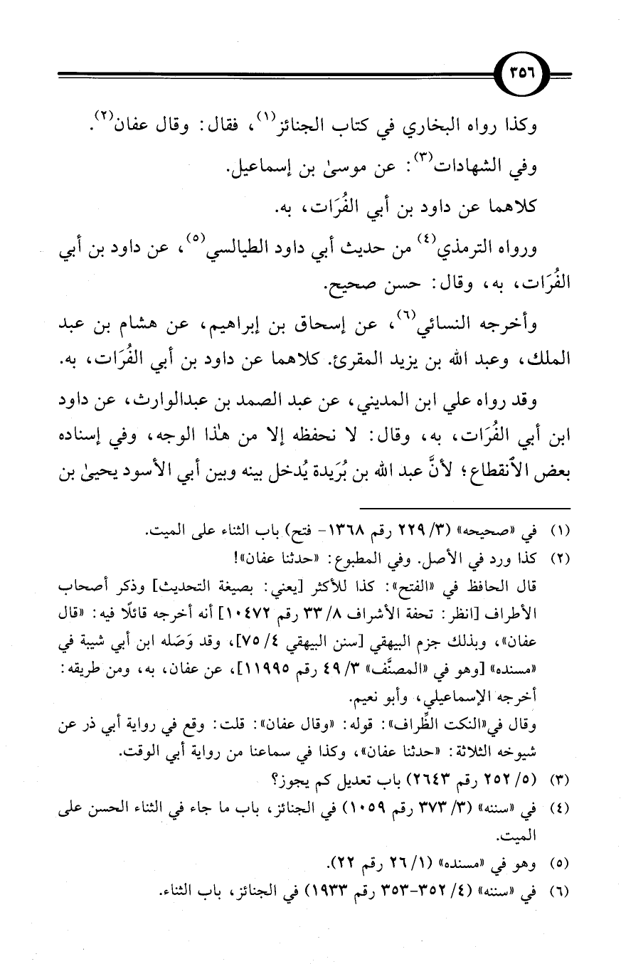 قال الحافظ في «الفتح»: كذا للأكثر [يعني: بصيغة التحديث] وذكر أصحاب الأطراف [انظر: تحفة الأشراف 8/ 33 رقم 10472] أنه أخرجه قائلاً فيه: «قال عفان»، وبذلك جزم البيهقي [سنن البيهقي 4/ 75]، وقد وَصَله ابن أبي شيبة في «مسنده» [وهو في «المصنَّف» 3/ 49 رقم 11995]، عن عفان، به، ومن طريقه: أخرجه الإسماعيلي، وأبو نعيم.