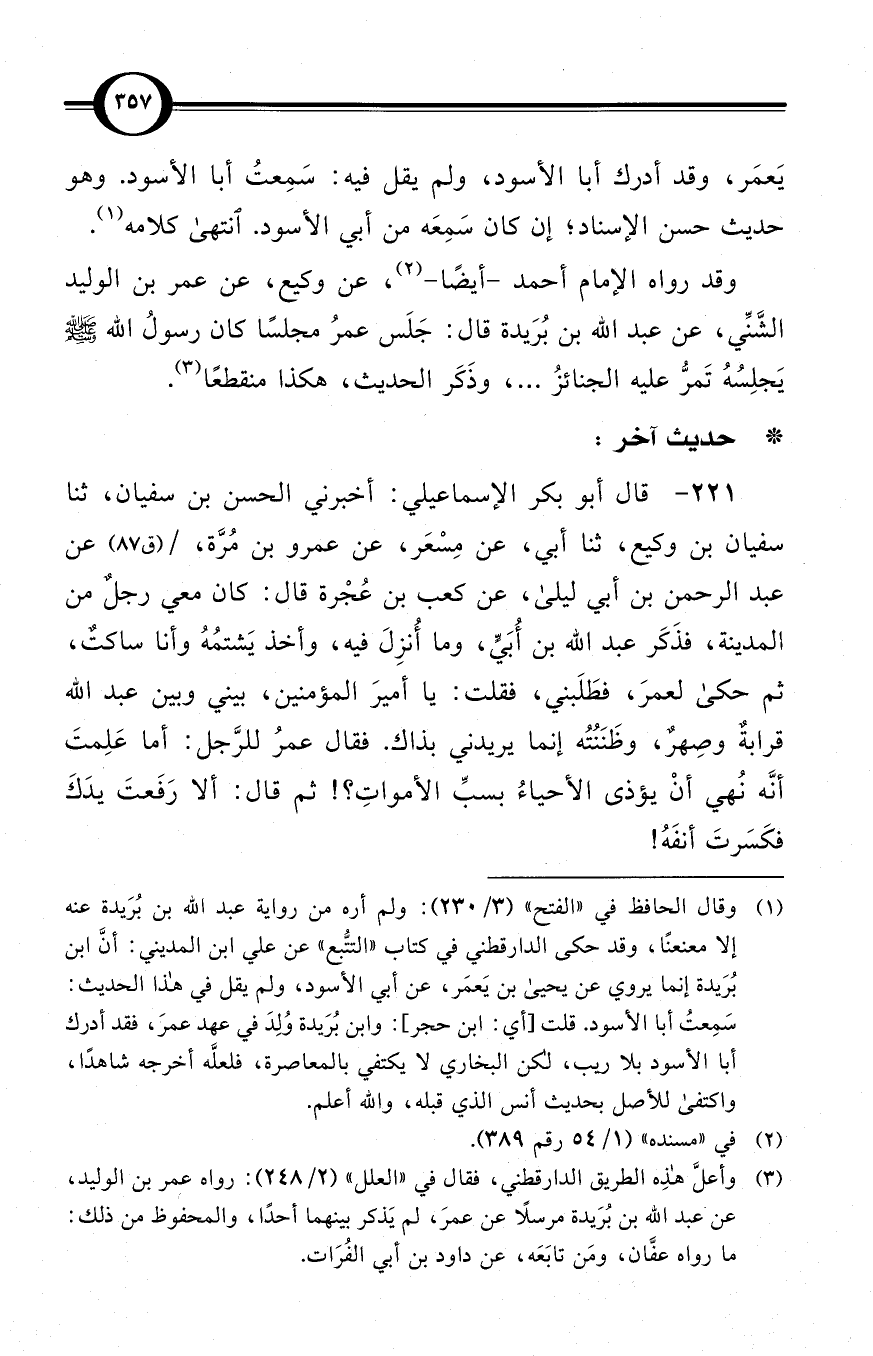 (221) قال أبو بكر الإسماعيلي: أخبرني الحسن بن سفيان، ثنا سفيان بن وكيع، ثنا أبي، عن مِسْعَر، عن عمرو بن مُرَّة، / (ق 87) عن عبد الرحمن بن أبي ليلى، عن كعب بن عُجْرة قال: كان معي رجلٌ من المدينة، فذَكَر عبد الله بن أُبَيٍّ، وما أُنزِلَ فيه، وأخذ يَشتمُهُ وأنا ساكتٌ، ثم حكى لعمرَ، فطَلَبني، فقلت: يا أميرَ المؤمنين، بيني وبين عبد الله قرابةٌ وصِهرٌ، وظَنَنُتُه إنما يريدني بذاك. فقال عمرُ للرَّجل: أما عَلِمتَ أنَّه نُهي أنْ يؤذَى الأحياءُ بسبِّ الأمواتِ؟! ثم قال: ألا رَفَعتَ يدَكَ فكَسَرتَ أنفَهُ!