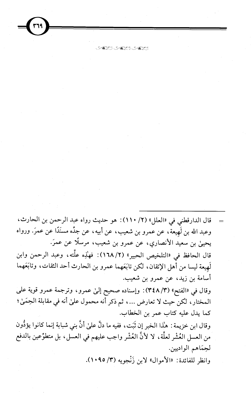 قال الحافظ في «التلخيص الحبير» (2/ 168): فهذه علَّته، وعبد الرحمن وابن لَهِيعة ليسا من أهل الإتقان، لكن تابَعَهما عمرو بن الحارث أحد الثقات، وتابَعَهما أسامة بن زيد، عن عمرو بن شعيب.