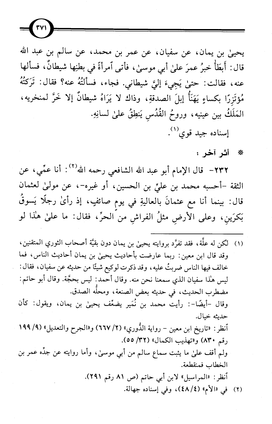 (¬1) له علَّة، فقد تفرَّد بروايته يحيى بن يمان دون بقيَّة أصحاب الثوري المتقنين، وقد قال ابن معين: ربما عارضت بأحاديث يحيى بن يمان أحاديث الناس، فما خالف فيها الناس ضربتُ عليه، وقد ذكرت لوكيع شيئًا من حديثه عن سفيان، فقال: ليس هذا سفيان الذي سمعنا نحن منه. وقال أحمد: ليس بحجَّة. وقال أبو حاتم: مضطرب الحديث، في حديثه بعض الصنعة، ومحلُّه الصدق. وقال -أيضًا-: رأيت محمد بن نُمَير يضعِّف يحيى بن يمان، ويقول: كأن حديثه خيال. انظر: «تاريخ ابن معين -رواية الدُّوري» (2/ 667) و «الجرح والتعديل» (9/ 199 رقم 830) و «تهذيب الكمال» (32/ 55).