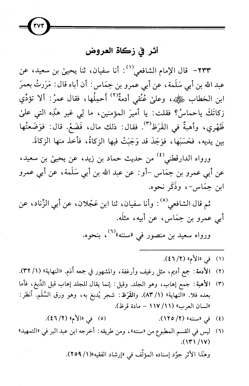 (233) قال الإمام الشافعي (¬1): أنا سفيان، ثنا يحيى بن سعيد، عن عبد الله بن أبي سَلَمة، عن أبي عمرو بن حِمَاس: أن أباه قال: مَرَرتُ بعمرَ بن الخطاب -رضي الله عنه-، وعلى عُنُقي أدمةٌ (¬2) أَحمِلُها، فقال عمرُ: ألا تؤدِّي زكاتَكَ ياحماسُ؟ فقلت: يا أميرَ المؤمنين، ما لِي غير هذه التي على ظَهْري، وأهبةٌ في القَرَظ (¬3). فقال: ذلك مال، فَضَعْ. قال: فوَضَعتُها بين يديه، فحَسَبَها، فوَجَدَ قد وَجَبَتْ فيها الزكاةُ، فأخذ منها الزكاةَ.