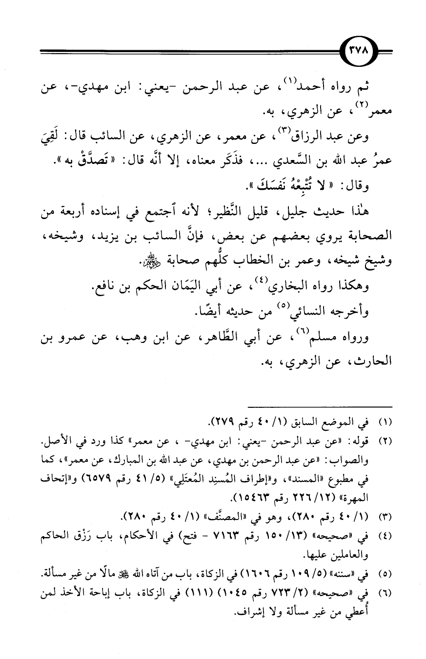 وعن عبد الرزاق (¬3)، عن معمر، عن الزهري، عن السائب قال: لَقِيَ عمرُ عبد الله بن السَّعدي ... ، فذَكَر معناه، إلا أنَّه قال: «تَصدَّقْ به».