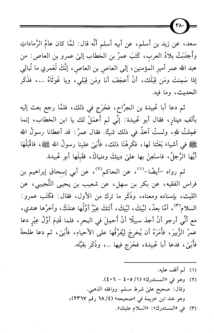 عن أبي إسحاق إبراهيم بن فراس الفقيه، عن بكر بن سهل، عن شعيب بن يحيى التُّجيبي، عن الليث، بإسناده ومعناه، وذَكَر ما ترك من الأول، فقال: فكَتَب عمرو: السلام (¬3)، أمَّا بعدُ، لبَّيكَ، لبَّيكَ، أَتَتكَ عِيْرٌ أوَّلُها عندَكَ، وآخرُها عندي، مع أنِّي أرجو أنْ أجدَ سبيلاً أنْ أَحمِلَ في البحرِ، فلما قَدِمَ أوَّلُ عِيْرٍ دعا عمرُ الزُّبيرَ، فأَمَرَهُ أن يُخرِجَ لِيُفرِّقُها على الأحياءِ، فأَبَى، ثم دعا طلحةَ فأَبَى، فدعا أبا عُبيدة، فخَرَج فيها ... ، وذَكَر بقيَّتَه.