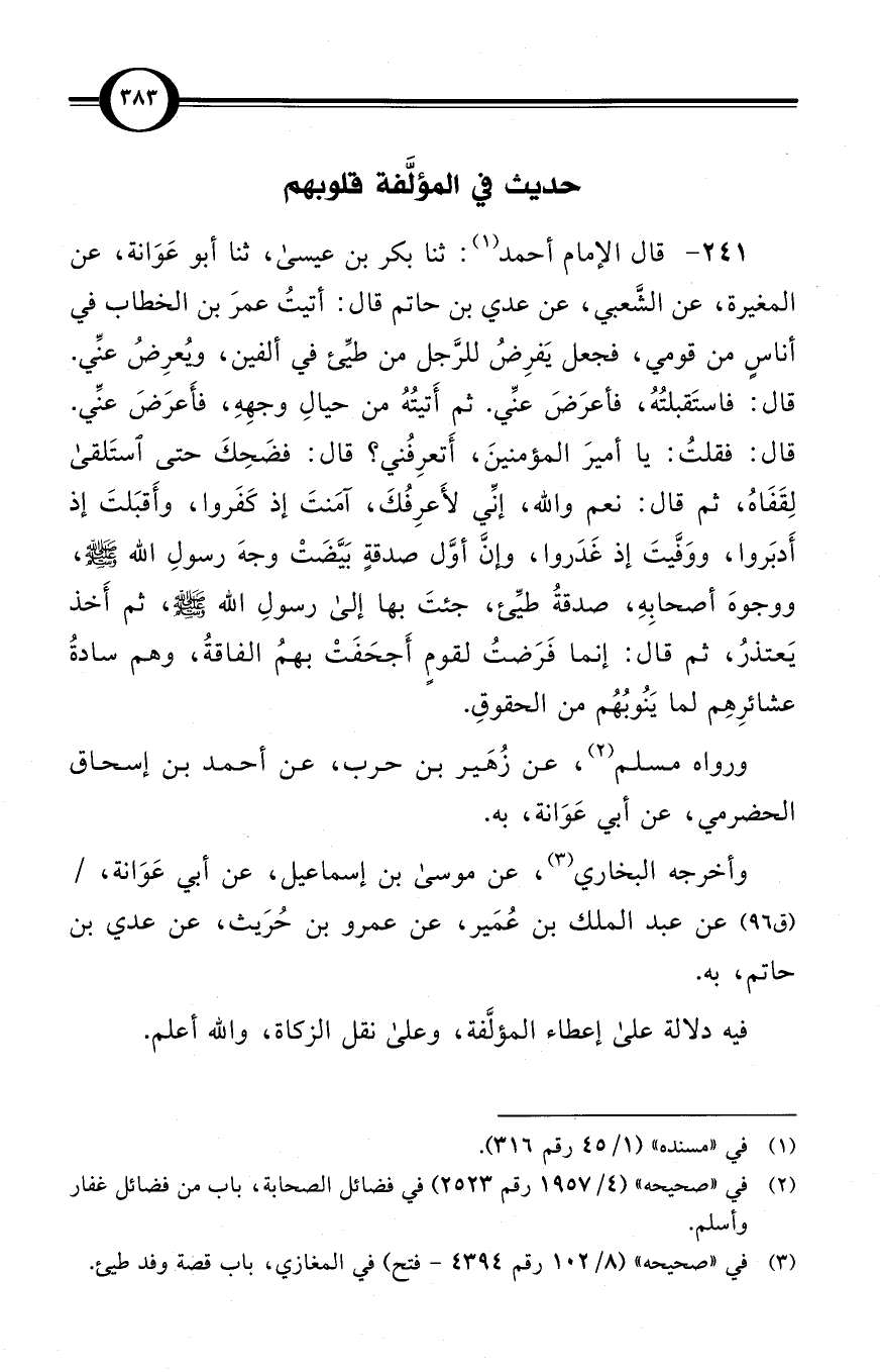 (241) قال الإمام أحمد (¬1): ثنا بكر بن عيسى، ثنا أبو عَوَانة، عن المغيرة، عن الشَّعبي، عن عدي بن حاتم قال: أتيتُ عمرَ بن الخطاب في أناسٍ من قومي، فجعل يَفرِضُ للرَّجل من طيِّئ في ألفين، ويُعرِضُ عنِّي. قال: فاستَقبلتُهُ، فأعرَضَ عنِّي. ثم أَتيتُهُ من حيالِ وجهِهِ، فأَعرَضَ عنِّي. قال: فقلتُ: يا أميرَ المؤمنينَ، أَتعرِفُني؟ قال: فضَحِكَ حتى استَلقى لِقَفَاهُ، ثم قال: نعم والله، إنِّي لأَعرِفُكَ، آمَنتَ إذ كَفَروا، وأَقبَلتَ إذ أَدبَروا، ووَفَّيتَ إذ غَدَروا، وإنَّ أوَّل صدقةٍ بَيَّضَتْ وجهَ رسولِ الله صلى الله عليه وسلم، ووجوهَ أصحابِهِ، صدقةُ طيِّئ، جئتَ بها إلى رسولِ الله صلى الله عليه وسلم، ثم أَخذ يَعتذرُ، ثم قال: إنما فَرَضتُ لقومٍ أَجحَفَتْ بهمُ الفاقةُ، وهم سادةُ عشائرِهِم لما يَنُوبُهُم من الحقوقِ.