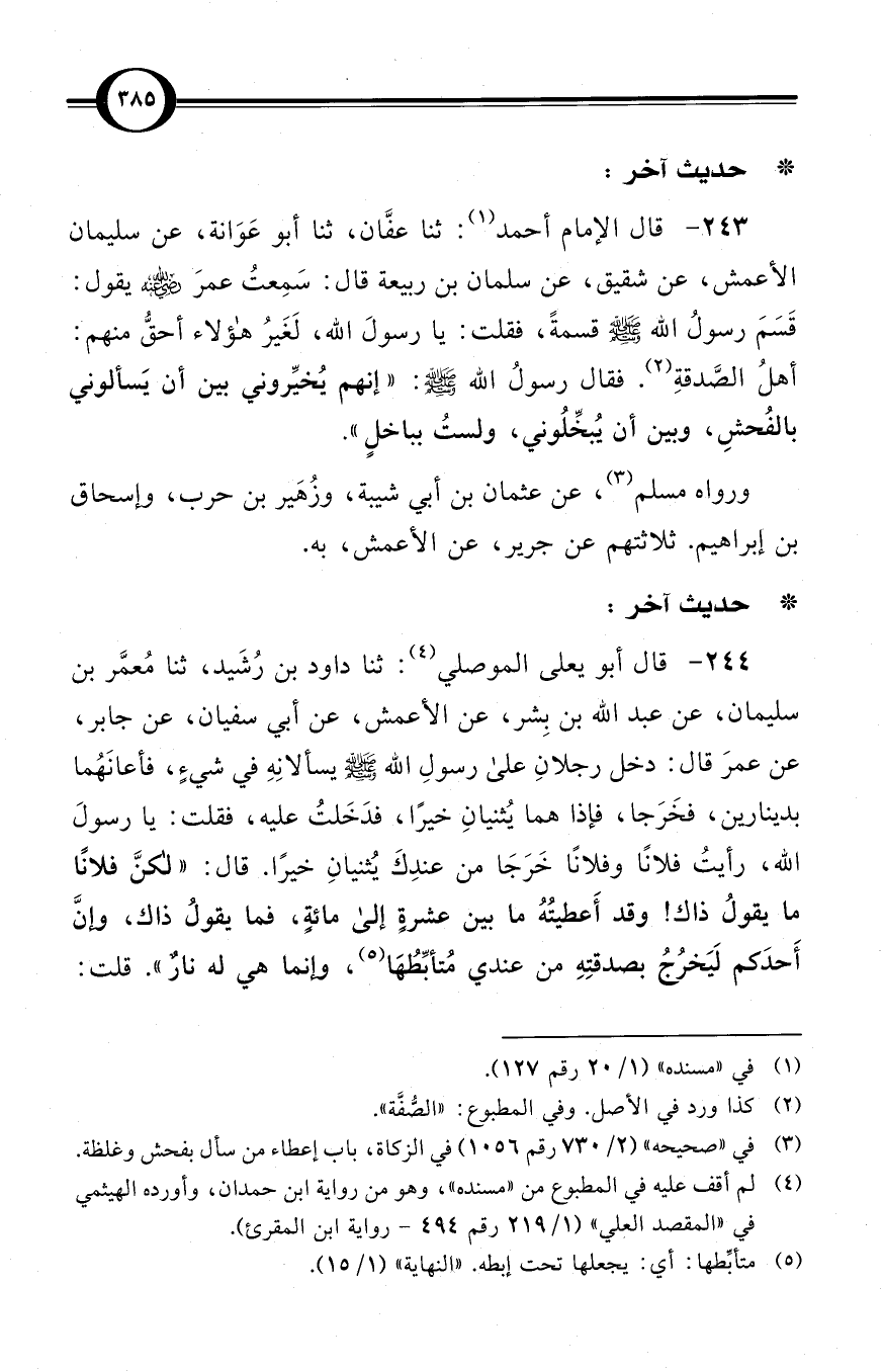 (243) قال الإمام أحمد (¬1): ثنا عفَّان، ثنا أبو عَوَانة، عن سليمان الأعمش، عن شقيق، عن سلمان بن ربيعة قال: سَمِعتُ عمرَ -رضي الله عنه- يقول: قَسَمَ رسولُ الله صلى الله عليه وسلم قسمةً، فقلت: يا رسولَ الله، لَغَيرُ هؤلاءِ أحقُّ منهم: أهلُ الصَّدقةِ (¬2). فقال رسولُ الله صلى الله عليه وسلم: «إنهم يُخيِّروني بين أن يَسألوني بالفُحشِ، وبين أن يُبخِّلُوني، ولستُ بباخلٍ».