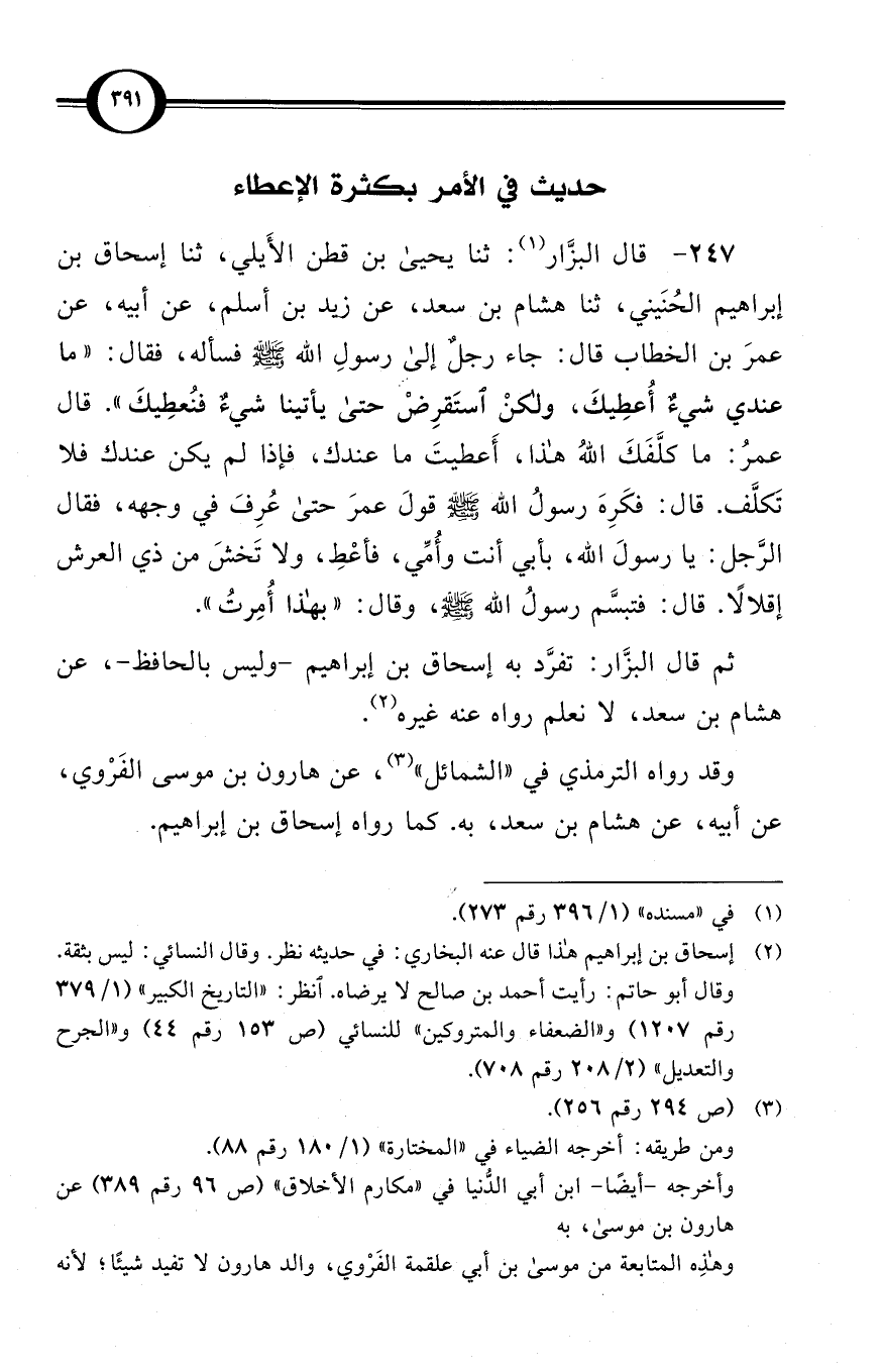 (247) قال البزَّار (¬1): ثنا يحيى بن قطن الأَيلي، ثنا إسحاق بن إبراهيم الحُنَيني، ثنا هشام بن سعد، عن زيد بن أسلم، عن أبيه، عن عمرَ بن الخطاب قال: جاء رجلٌ إلى رسولِ الله صلى الله عليه وسلم فسأله، فقال: «ما عندي شيءٌ أُعطِيكَ، ولكنْ استَقرِضْ حتى يأتينا شيءٌ فنُعطِيكَ». قال عمرُ: ما كلَّفَكَ اللهُ هذا، أَعطيتَ ما عندك، فإذا لم يكن عندك فلا تَكلَّف. قال: فكَرِهَ رسولُ الله صلى الله عليه وسلم قولَ عمرَ حتى عُرِفَ في وجهه، فقال الرَّجل: يا رسولَ الله، بأبي أنت وأُمِّي، فأعْطِ، ولا تَخشَ من ذي العرش إقلالاً. قال: فتبسَّم رسولُ الله صلى الله عليه وسلم، وقال: «بهذا أُمِرتُ».