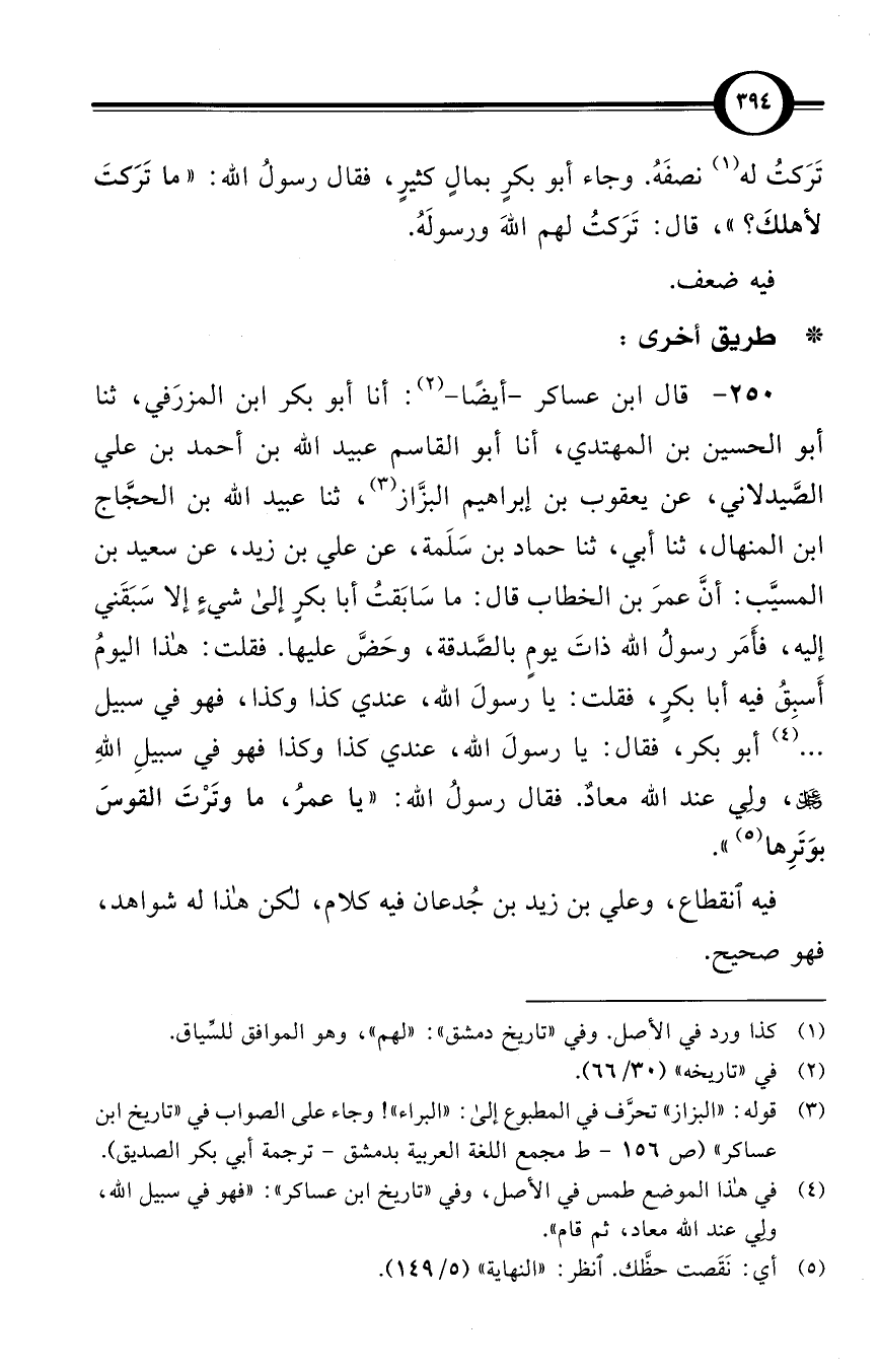 (250) قال ابن عساكر -أيضًا- (¬2): أنا أبو بكر ابن المزرَفي، ثنا أبو الحسين بن المهتدي، أنا أبو القاسم عبيد الله بن أحمد بن علي الصَّيدلاني، عن يعقوب بن إبراهيم البزَّاز (¬3)، ثنا عبيد الله بن الحجَّاج بن المنهال، ثنا أبي، ثنا حماد بن سَلَمة، عن علي بن زيد، عن سعيد بن المسيّب: أنَّ عمرَ بن الخطاب قال: ما سَابَقتُ أبا بكرٍ إلى شيءٍ إلا سَبَقَني إليه، فأَمَر رسولُ الله ذاتَ يومٍ بالصَّدقة، وحَضَّ عليها. فقلت: هذا اليومُ أَسبِقُ فيه أبا بكرٍ، فقلت: يا رسولَ الله، عندي كذا وكذا، فهو في سبيل ... (¬4) أبو بكر، فقال: يا رسولَ الله، عندي كذا وكذا فهو في سبيلِ اللهِ عزَّ وجلَّ، ولِي عند الله معادٌ. فقال رسولُ الله: «يا عمرُ، ما وتَرْتَ القوسَ بوَتَرِها (¬5)».
