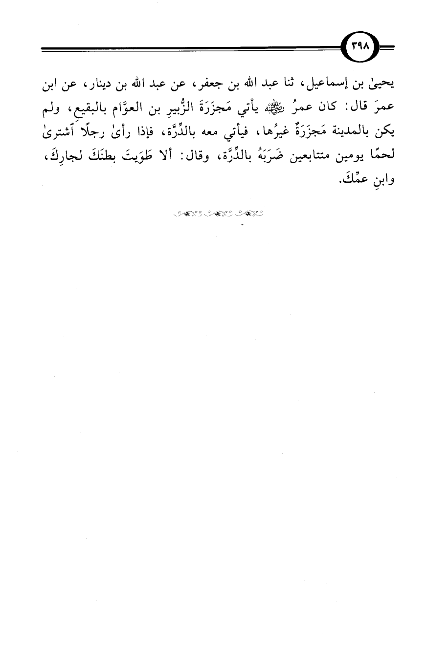 يحيى بن إسماعيل، ثنا عبد الله بن جعفر، عن عبد الله بن دينار، عن ابن عمرَ قال: كان عمرُ -رضي الله عنه- يأتي مَجزَرَةَ الزُّبيرِ بن العوَّام بالبقيعِ، ولم يكن بالمدينة مَجزَرَةٌ غيرُها، فيأتي معه بالدِّرَّة، فإذا رأى رجلاً اشترى لحمًا يومين متتابعين ضَرَبَهُ بالدِّرَّة، وقال: ألا طَوَيتَ بطنَكَ لجارِكَ، وابنِ عمِّكَ.