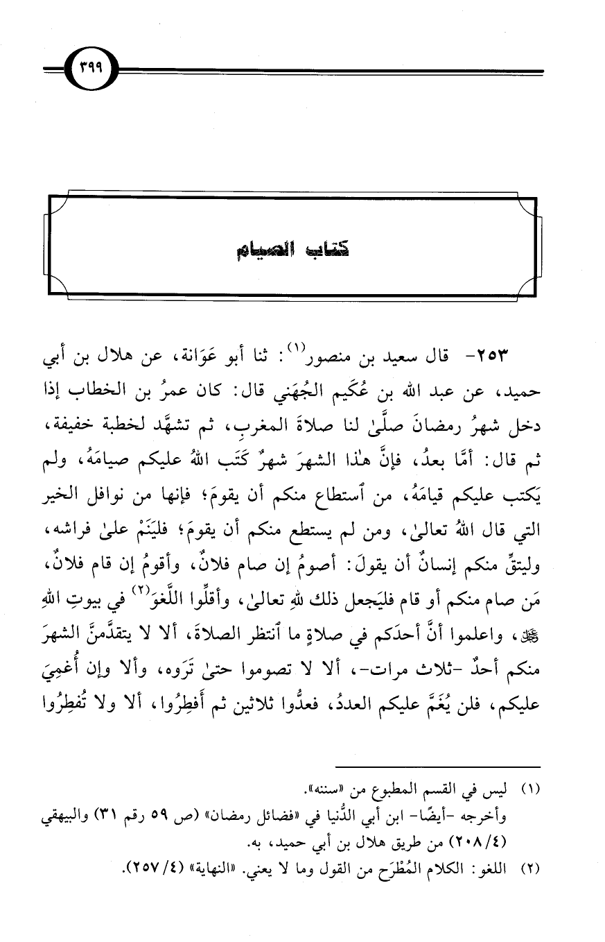 (253) قال سعيد بن منصور (¬1): ثنا أبو عَوَانة، عن هلال بن أبي حميد، عن عبد الله بن عُكَيم الجُهَني قال: كان عمرُ بن الخطاب إذا دخل شهرُ رمضانَ صلَّى لنا صلاةَ المغربِ، ثم تشهَّد لخطبة خفيفة، ثم قال: أمَّا بعدُ، فإنَّ هذا الشهرَ شهرٌ كَتَب اللهُ عليكم صيامَهُ، ولم يَكتب عليكم قيامَهُ، من استطاع منكم أن يقومَ؛ فإنها من نوافل الخير التي قال اللهُ تعالى، ومن لم يستطع منكم أن يقومَ؛ فليَنَمْ على فراشه، وليتقِّ منكم إنسانٌ أن يقولَ: أصومُ إن صام فلانٌ، وأقومُ إن قام فلانٌ، مَن صام منكم أو قام فليَجعل ذلك للهِ تعالى، وأقلِّوا اللَّغوَ (¬2) في بيوتِ اللهِ عزَّ وجلَّ، واعلموا أنَّ أحدَكم في صلاةٍ ما انتظر الصلاةَ، ألا لا يتقدَّمنَّ الشهرَ منكم أحدٌ -ثلاث مرات-، ألا لا تصوموا حتى تَرَوه، وألا وإن أُغمِيَ عليكم، فلن يُغَمَّ عليكم العددُ، فعدُّوا ثلاثين ثم أَفطِرُوا، ألا ولا تُفطِرُوا