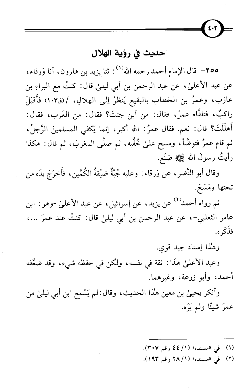(255) قال الإمام أحمد رحمه الله (¬1): ثنا يزيد بن هارون، أنا وَرقاء، عن عبد الأعلى، عن عبد الرحمن بن أبي ليلى قال: كنتُ مع البراءِ بن عازب، وعمرُ بن الخطاب بالبقيع يَنظرُ إلى الهلالِ، / (ق 103) فأَقبَلَ راكبٌ، فتلقَّاه عمرُ، فقال: من أين جئتَ؟ فقال: من الغَرب، فقال: أَهلَلْتَ؟ قال: نعم. فقال عمرُ: الله أكبر، إنما يَكفي المسلمينَ الرَّجلُ، ثم قام عمرُ فتوضَّأ، ومسح على خُفَّيه، ثم صلَّى المغربَ، ثم قال: هكذا رأيتُ رسولَ الله صلى الله عليه وسلم صَنَع.