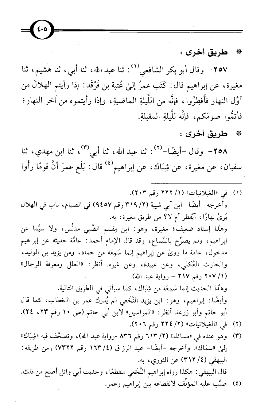 (257) وقال أبو بكر الشافعي (¬1): ثنا عبد الله، ثنا أبي، ثنا هشيم، ثنا مغيرة، عن إبراهيم قال: كَتَب عمرُ إلى عُتبة بن فَرْقَد: إذا رأيتم الهلالَ من أوَّل النهار فأَفطِرُوا، فإنَّه من اللَّيلةِ الماضيةِ، وإذا رأيتموه من آخر النهار؛ فأتمُّوا صومَكم، فإنَّه للَّيلةِ المقبلةِ.