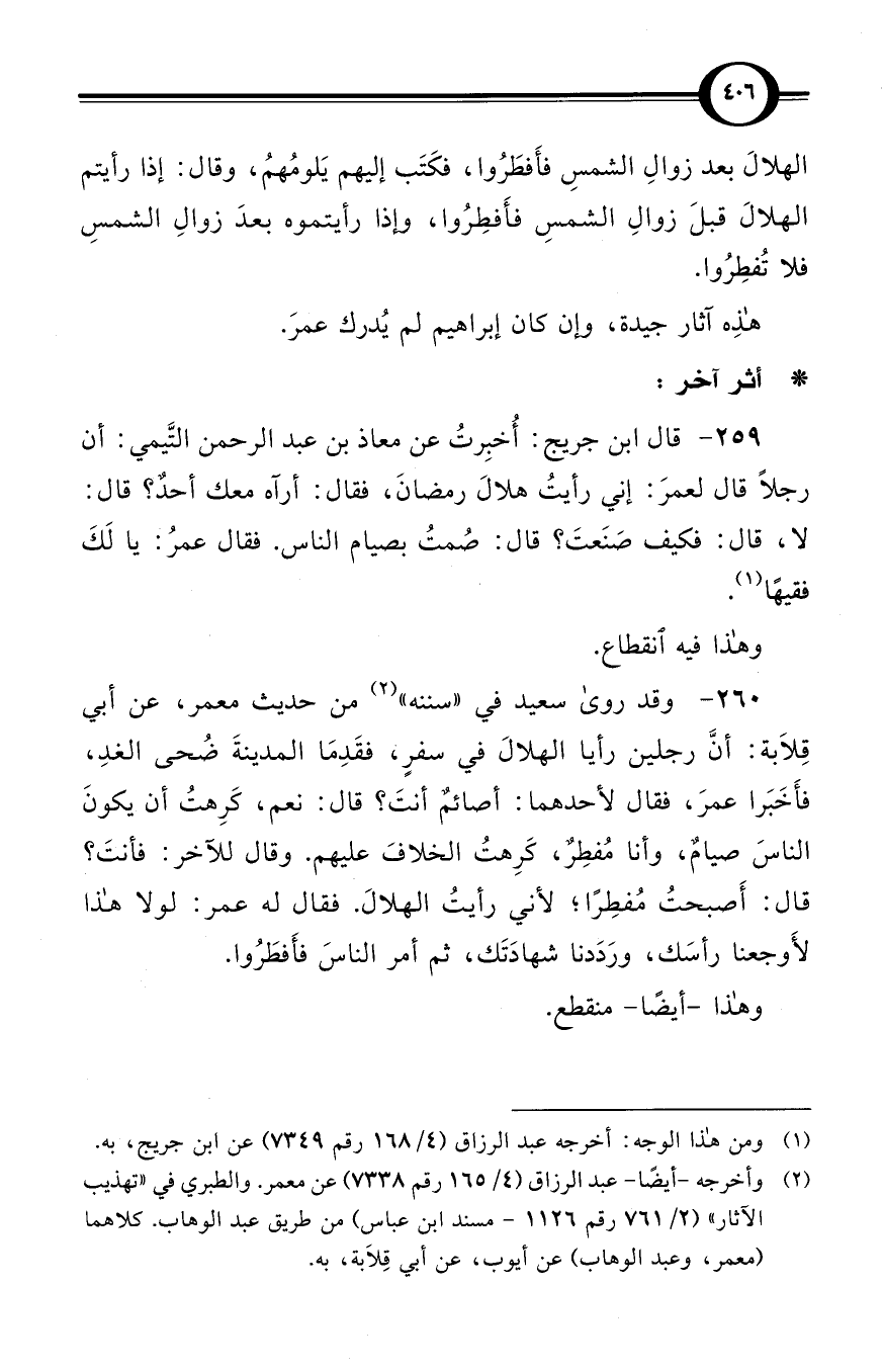 (259) قال ابن جريج: أُخبِرتُ عن معاذ بن عبد الرحمن التَّيمي: أن رجلاً قال لعمرَ: إني رأيتُ هلالَ رمضانَ، فقال: أرآه معك أحدٌ؟ قال: لا، قال: فكيف صَنَعتَ؟ قال: صُمتُ بصيام الناس. فقال عمرُ: يا لَكَ فقيهًا (¬1).