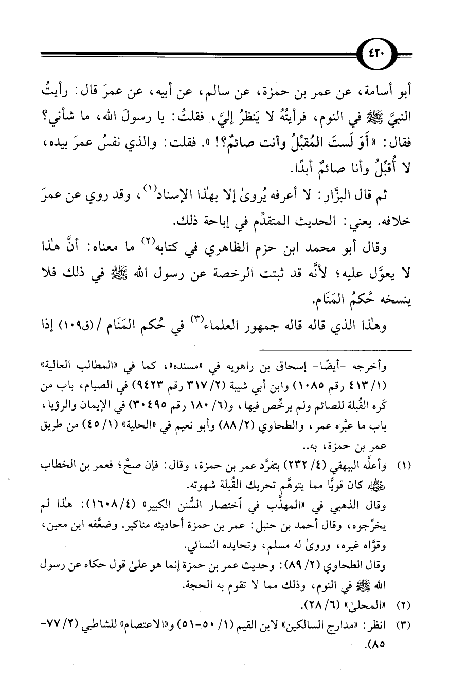 أبو أسامة، عن عمر بن حمزة، عن سالم، عن أبيه، عن عمرَ قال: رأيتُ النبيَّ صلى الله عليه وسلم في النوم، فرأيتُهُ لا يَنظرُ إليَّ، فقلتُ: يا رسولَ الله، ما شأني؟ فقال: «أَوَ لَستَ المُقبِّلُ وأنت صائمٌ؟!». فقلت: والذي نفسُ عمرَ بيده، لا أُقبِّلُ وأنا صائمٌ أبدًا.