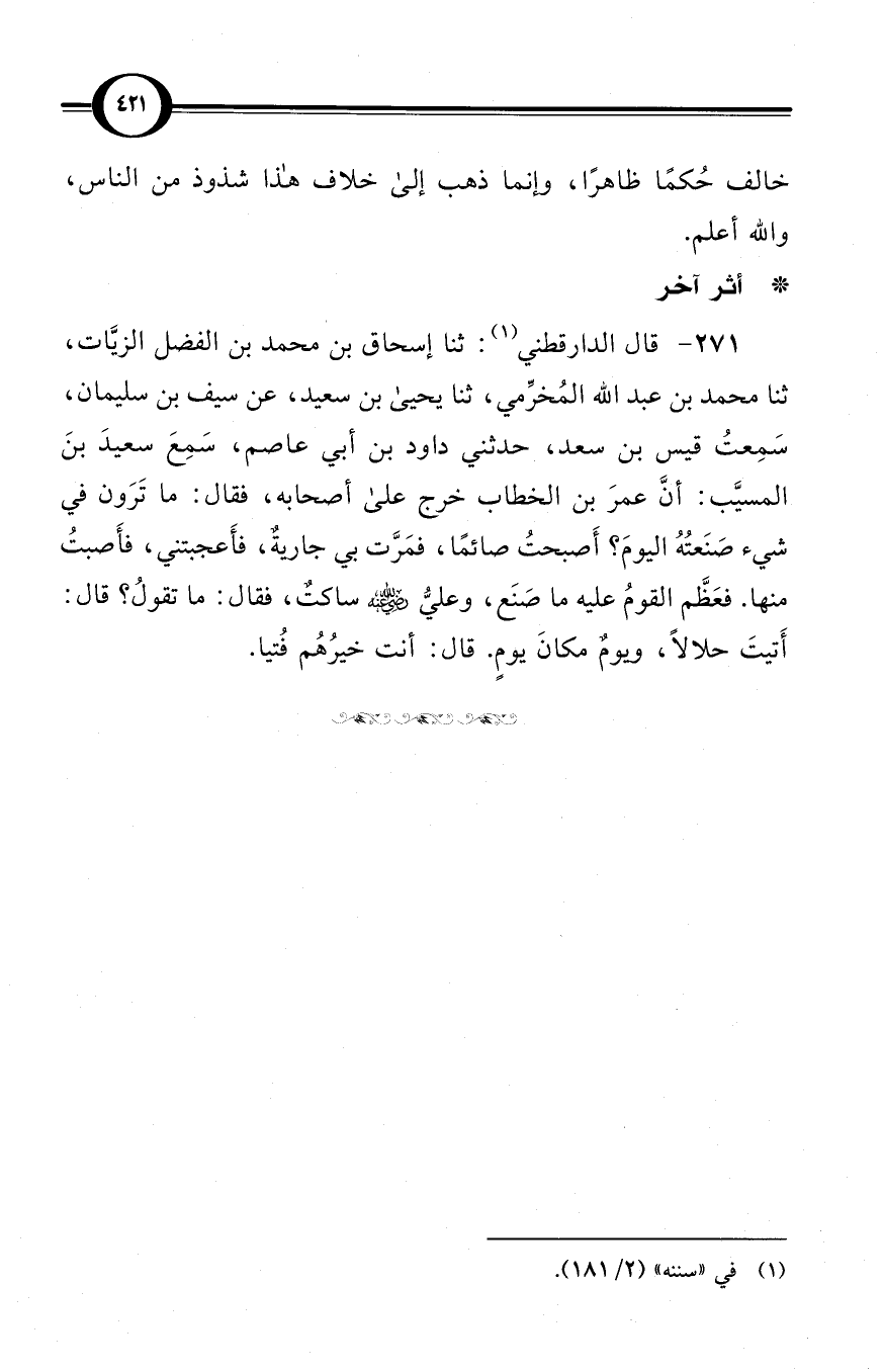 (271) قال الدارقطني (¬1): ثنا إسحاق بن محمد بن الفضل الزيَّات، ثنا محمد بن عبد الله المُخرِّمي، ثنا يحيى بن سعيد، عن سيف بن سليمان، سَمِعتُ قيس بن سعد، حدثني داود بن أبي عاصم، سَمِعَ سعيدَ بنَ المسيّب: أنَّ عمرَ بن الخطاب خرج على أصحابه، فقال: ما تَرَون في شيء صَنَعتُهُ اليومَ؟ أَصبحتُ صائمًا، فمَرَّت بي جاريةٌ، فأَعجبتني، فأَصبتُ منها. فعَظَّم القومُ عليه ما صَنَع، وعليُّ -رضي الله عنه- ساكتٌ، فقال: ما تقولُ؟ قال: أَتيتَ حلالاً، ويومٌ مكانَ يومٍ. قال: أنت خيرُهُم فُتيا.