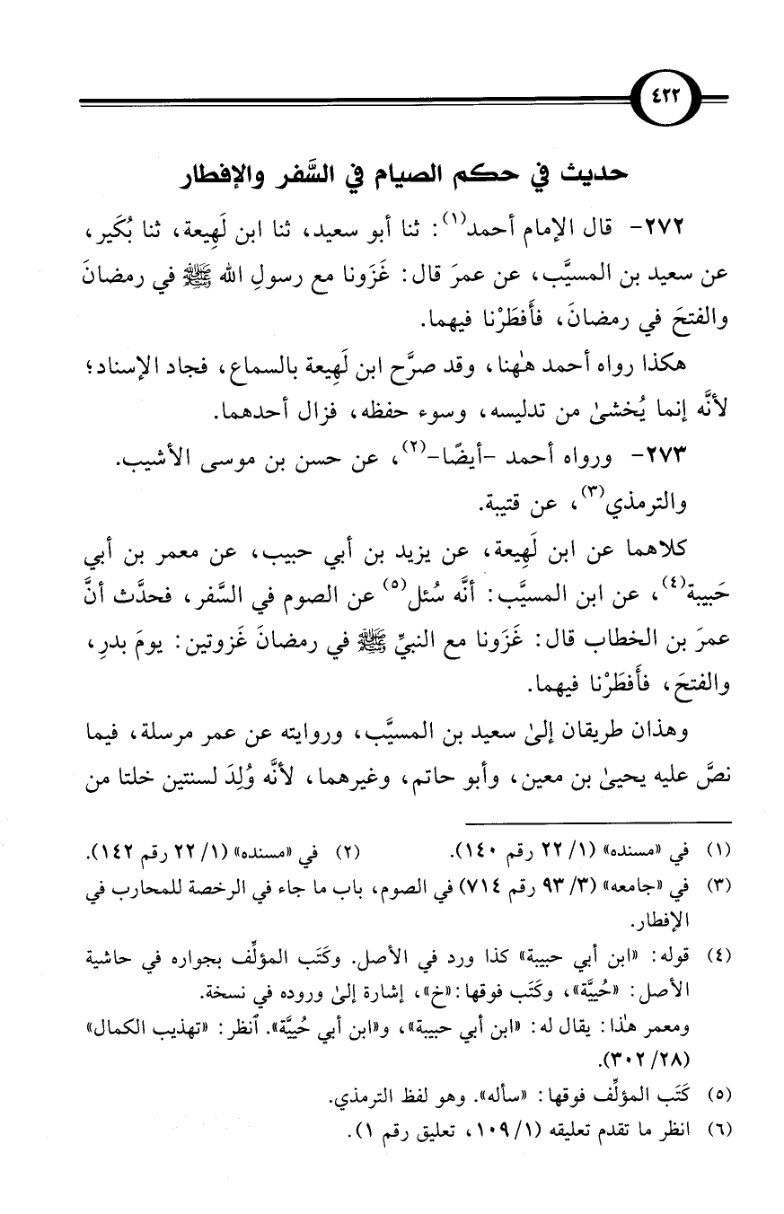 (272) قال الإمام أحمد (¬1): ثنا أبو سعيد، ثنا ابن لَهِيعة، ثنا بُكَير، عن سعيد بن المسيّب، عن عمرَ قال: غَزَونا مع رسولِ الله صلى الله عليه وسلم في رمضانَ والفتحَ في رمضانَ، فأَفطَرْنا فيهما.