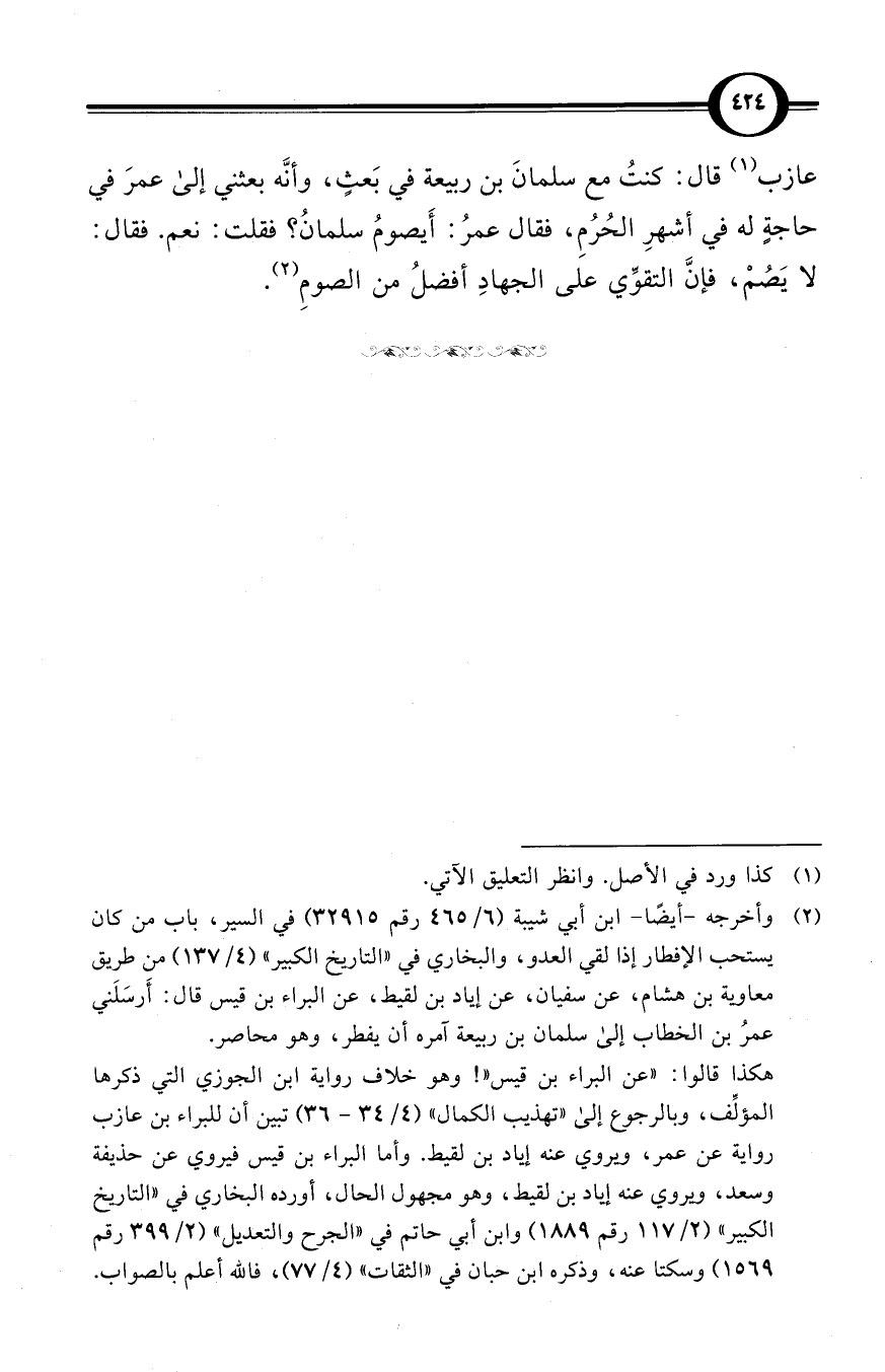 عازب (¬1) قال: كنتُ مع سلمانَ بن ربيعة في بَعثٍ، وأنَّه بعثني إلى عمرَ في حاجةٍ له في أشهرِ الحُرُمِ، فقال عمرُ: أَيصومُ سلمانُ؟ فقلت: نعم. فقال: لا يَصُمْ، فإنَّ التقوِّي على الجهادِ أفضلُ من الصومِ (¬2).