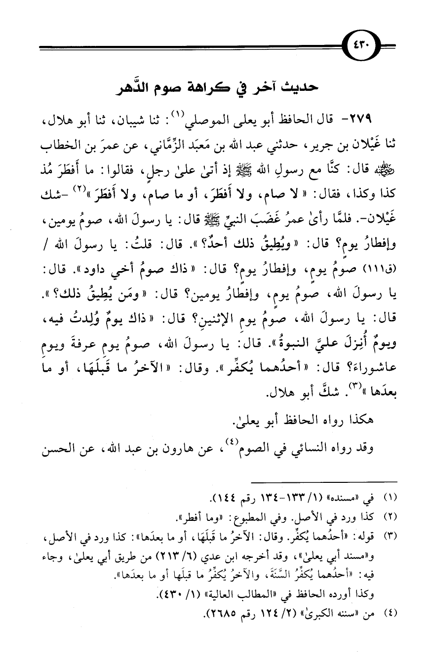 (279) قال الحافظ أبو يعلى الموصلي (¬1): ثنا شيبان، ثنا أبو هلال، ثنا غَيْلان بن جرير، حدثني عبد الله بن مَعبَد الزِّمَّاني، عن عمرَ بن الخطاب -رضي الله عنه- قال: كنَّا مع رسولِ الله صلى الله عليه وسلم إذ أتى على رجلٍ، فقالوا: ما أَفطَرَ مُذ كذا وكذا، فقال: «لا صام، ولا أَفطَرَ، أو ما صام، ولا أَفطَرَ» (¬2) -شك غَيْلان-. فلمَّا رأى عمرُ غَضَبَ النبيِّ صلى الله عليه وسلم قال: يا رسولَ الله، صومُ يومين، وإفطارُ يومٍ؟ قال: «ويُطِيقُ ذلك أحدٌ؟». قال: قلتُ: يا رسولَ الله / (ق 111) صومُ يومٍ، وإفطارُ يومٍ؟ قال: «ذاك صومُ أخي داود». قال: يا رسولَ الله، صومُ يومٍ، وإفطارُ يومين؟ قال: «ومَن يُطِيقُ ذلك؟». قال: يا رسولَ الله، صومُ يومِ الإثنينِ؟ قال: «ذاك يومٌ وُلِدتُ فيه، ويومٌ أُنِزلَ عليَّ النبوةُ». قال: يا رسولَ الله، صومُ يومِ عرفةَ ويومِ عاشوراءَ؟ قال: «أحدُهما يُكفِّر». وقال: «الآخرُ ما قَبلَهَا، أو ما بعدَها» (¬3). شكَّ أبو هلال.