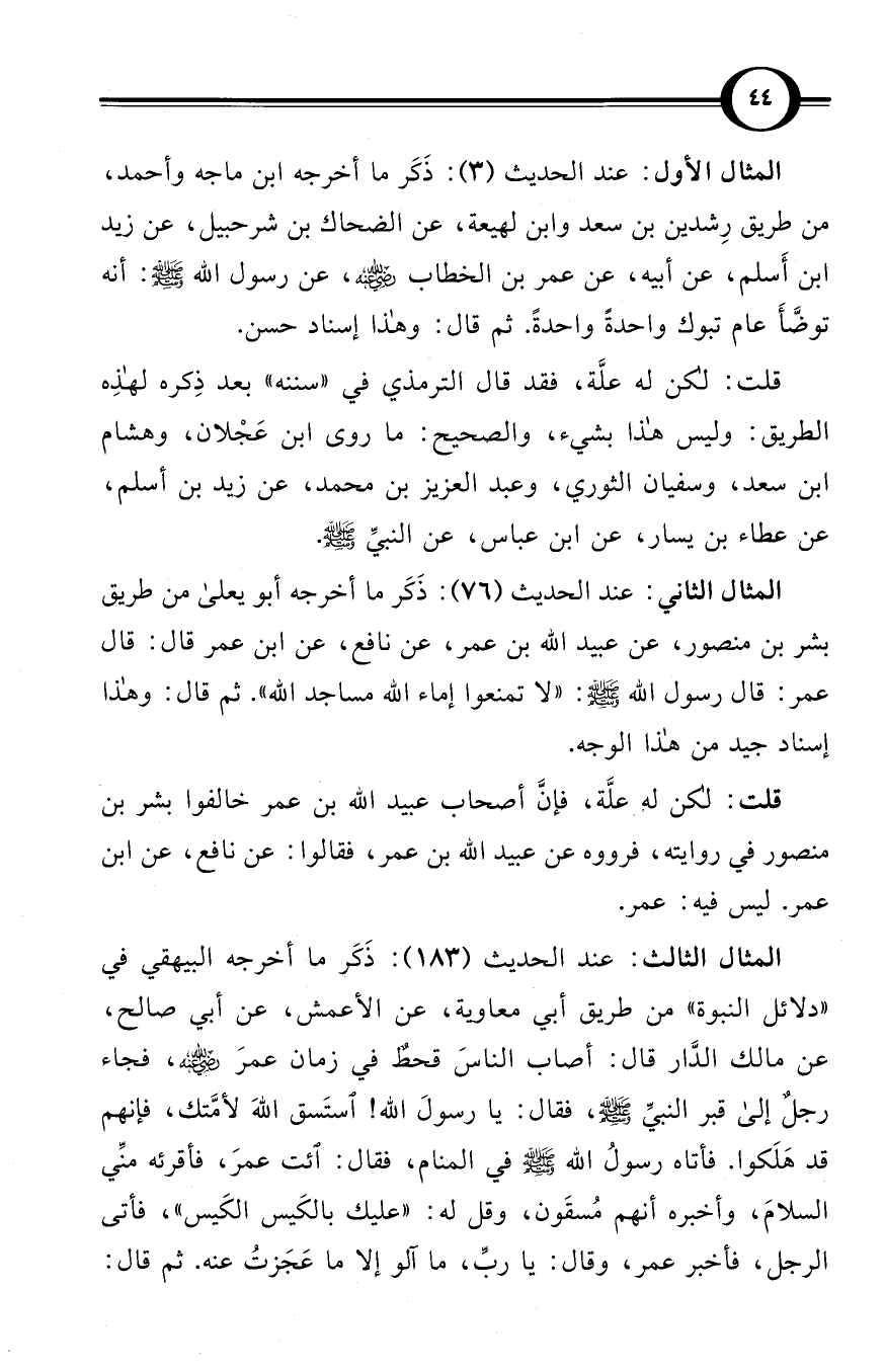 المثال الثالث: عند الحديث رقم (183): ذَكَر ما أخرجه البيهقي في «دلائل النبوة» من طريق أبي معاوية، عن الأعمش، عن أبي صالح، عن مالك الدَّار قال: أصاب الناسَ قحطٌ في زمان عمرَ -رضي الله عنه-، فجاء رجلٌ إلى قبر النبيِّ صلى الله عليه وسلم، فقال: يا رسولَ الله! استَسق اللهَ لأمَّتك، فإنهم قد هَلَكوا. فأتاه رسولُ الله صلى الله عليه وسلم في المنام، فقال: ائت عمرَ، فأقرئه منِّي السلامَ، وأخبره أنهم مُسقَون، وقل له: «عليك بالكَيس الكَيس»، فأتى الرجل، فأخبر عمر، وقال: يا ربُّ، ما آلو إلا ما عَجِزتُ عنه. ثم قال: