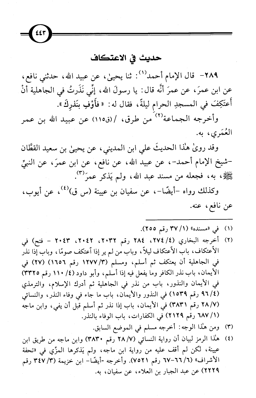 (289) قال الإمام أحمد (¬1): ثنا يحيى، عن عبيد الله، حدثني نافع، عن ابن عمرَ، عن عمرَ أنَّه قال: يا رسولَ الله، إنِّي نَذَرتُ في الجاهلية أنْ أَعتَكِفَ في المسجدِ الحرامِ ليلةً، فقال له: «فأَوْفِ بنَذرِكَ».