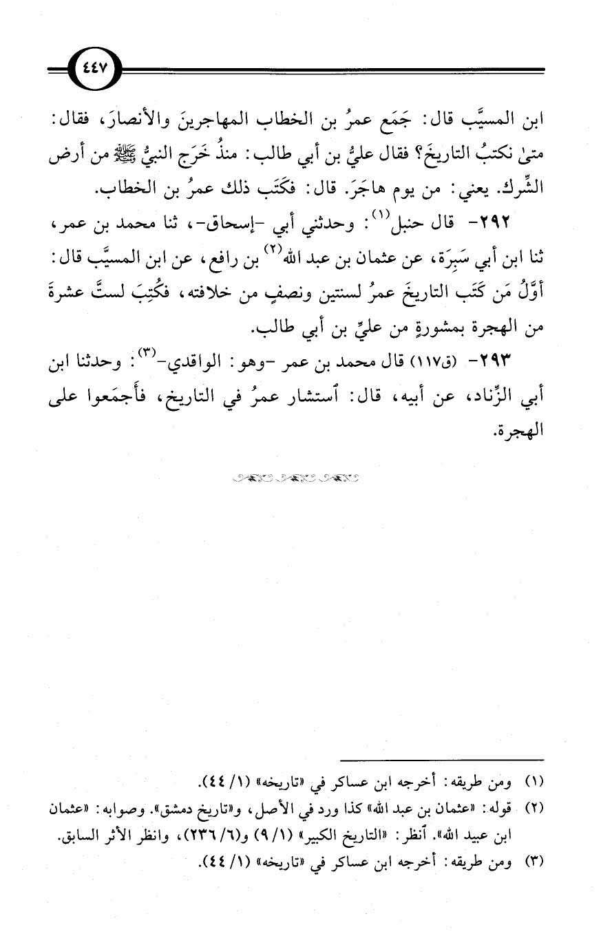 (292) قال حنبل (¬1): وحدثني أبي -إسحاق-، ثنا محمد بن عمر، ثنا ابن أبي سَبِرَة، عن عثمان بن عبد الله (¬2) بن رافع، عن ابن المسيّب قال: أوَّلُ مَن كَتَب التاريخَ عمرُ لسنتين ونصفٍ من خلافته، فكُتِبَ لستَّ عشرةَ من الهجرة بمشورةٍ من عليِّ بن أبي طالب.