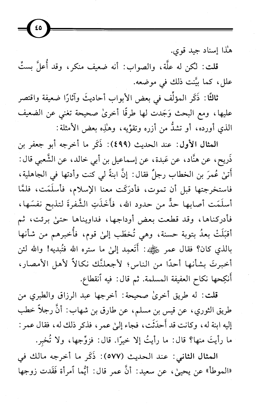 المثال الأول: عند الحديث رقم (499): ذَكَر ما أخرجه أبو جعفر بن ذَريح، عن هنَّاد، عن عَبدة، عن إسماعيل بن أبي خالد، عن الشَّعبي قال: أَتى عُمرَ بن الخطاب رجلٌ فقال: إنَّ ابنةً لي كنت وأدتها في الجاهلية، فاستخرجتها قبل أن تموت، فأدرَكَت معنا الإسلام، فأسلَمَت، فلمَّا أسلَمَت أصابها حدٌّ من حدود الله، فأَخَذَتْ الشَّفرةَ لتذبح نفسَها، فأدركناها، وقد قطعت بعض أوداجها، فداويناها حتى برئت، ثم أقبَلَتْ بعدُ بتوبة حسنة، وهي تُخطَب إلى قوم، فأُخبرهم من شأنها بالذي كان؟ فقال عمر رضي الله عنه: أَتَعمِد إلى ما ستره الله فتُبديه! والله لئن أخبرتَ بشأنها أحدًا من الناس؛ لأجعلنَّك نكالاً لأهل الأمصار، أَنكِحها نكاح العفيفة المسلمة. ثم قال: فيه انقطاع.