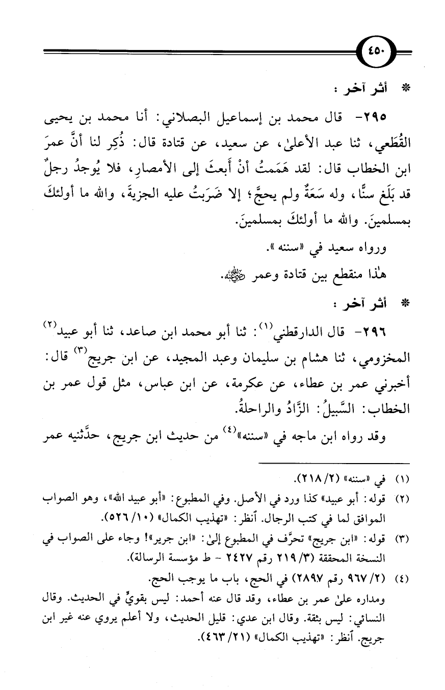 (295) قال محمد بن إسماعيل البصلاني: أنا محمد بن يحيى القُطَعي، ثنا عبد الأعلى، عن سعيد، عن قتادة قال: ذُكِر لنا أنَّ عمرَ بن الخطاب قال: لقد هَمَمتُ أنْ أَبعثَ إلى الأمصارِ، فلا يُوجدُ رجلٌ قد بَلَغ سنًّا، وله سَعَةٌ ولم يحجَّ؛ إلا ضَرَبتُ عليه الجزيةَ، والله ما أولئكَ بمسلمينَ. والله ما أولئكَ بمسلمينَ.