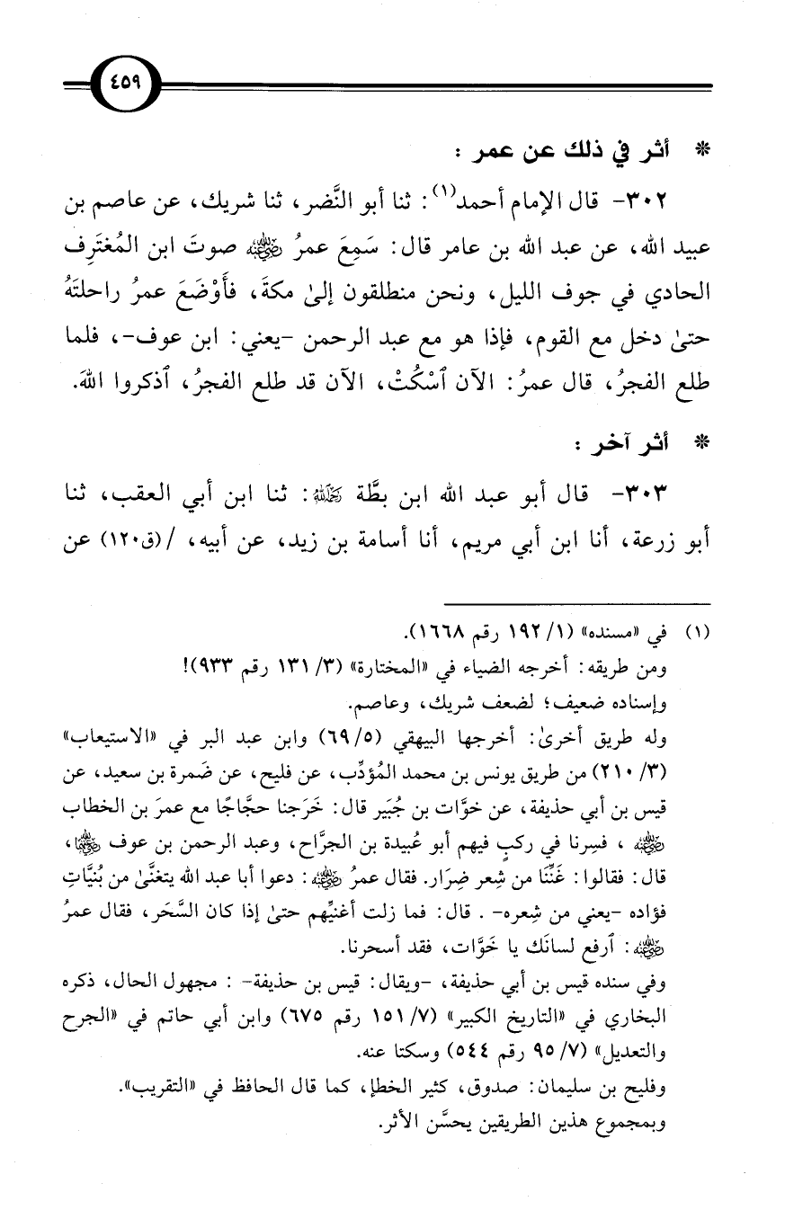 ثنا أبو النَّضر، ثنا شريك، عن عاصم بن عبيد الله، عن عبد الله بن عامر قال: سَمِعَ عمرُ -رضي الله عنه- صوتَ ابن المُغتَرِف الحادي في جوف الليل، ونحن منطلقون إلى مكةَ، فأَوْضَعَ عمرُ راحلتَهُ حتى دخل مع القوم، فإذا هو مع عبد الرحمن -يعني: ابن عوف-، فلما طلع الفجرُ، قال عمرُ: الآن اسْكُتْ، الآن قد طلع الفجرُ، اذكروا اللهَ.