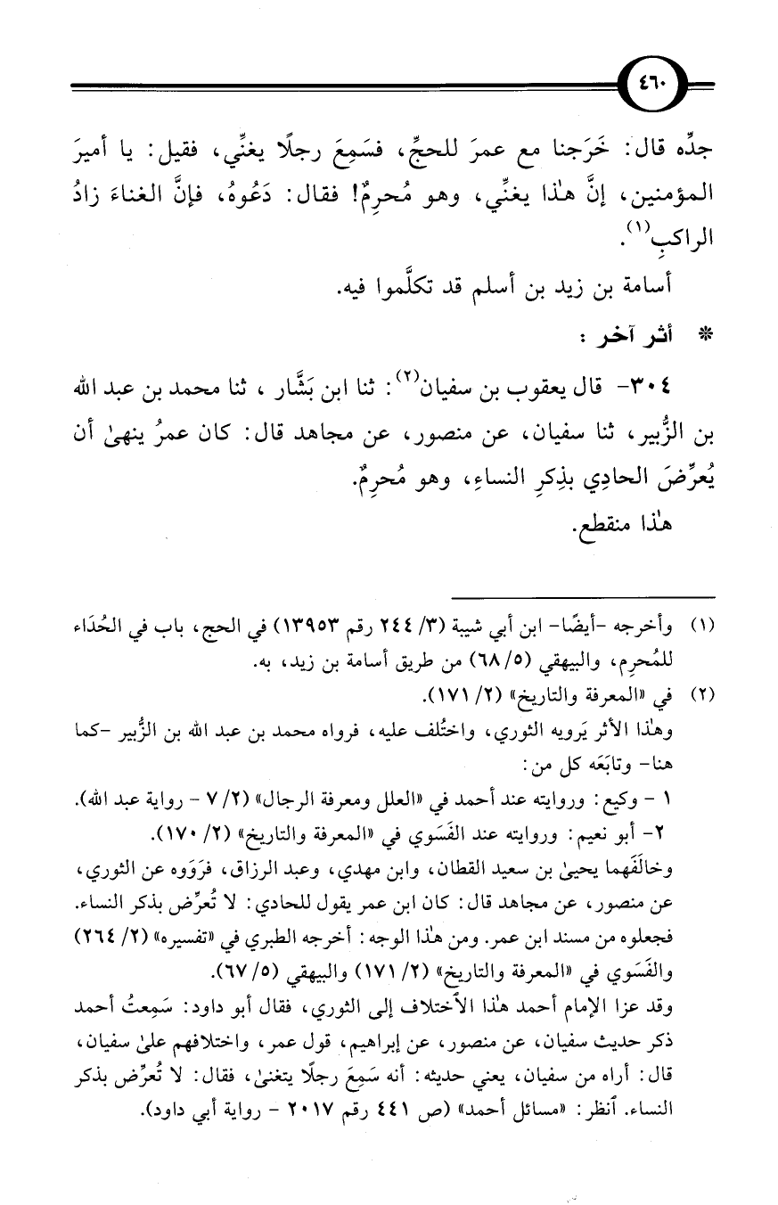 ثنا ابن بَشَّار، ثنا محمد بن عبد الله بن الزُّبير، ثنا سفيان، عن منصور، عن مجاهد قال: كان عمرُ ينهى أن يُعرِّضَ الحادِي بذِكرِ النساءِ، وهو مُحرِمٌ.