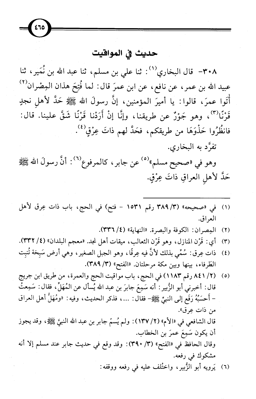 (308) قال البخاري (¬1): ثنا علي بن مسلم، ثنا عبد الله بن نُمَير، ثنا عبيد الله بن عمر، عن نافع، عن ابن عمرَ قال: لما فُتِحَ هذان المِصْران (¬2) أَتَوا عمرَ، قالوا: يا أميرَ المؤمنين، إنَّ رسولَ الله صلى الله عليه وسلم حَدَّ لأهلِ نجدٍ قَرْنًا (¬3)، وهو جَوْرٌ عن طريقنا، وإنَّا إنْ أَرَدْنا قَرْنًا شَقَّ علينا. قال: فانظُرُوا حَذْوَهَا من طريقكم، فحَدَّ لهم ذاتَ عِرْقٍ (¬4).