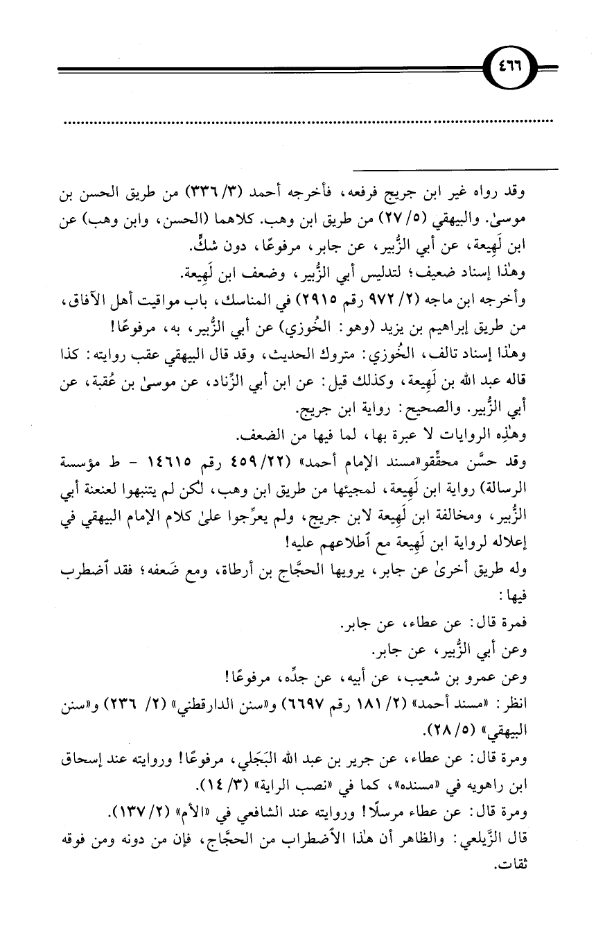 وقد حسَّن محقِّقو «مسند الإمام أحمد» (22/ 459 رقم 14615 - ط مؤسسة الرسالة) رواية ابن لَهِيعة، لمجيئها من طريق ابن وهب، لكن لم يتنبهوا لعنعنة أبي الزُّبير، ومخالفة ابن لَهِيعة لابن جريج، ولم يعرِّجوا على كلام الإمام البيهقي في إعلاله لرواية ابن لَهِيعة مع اطلاعهم عليه!