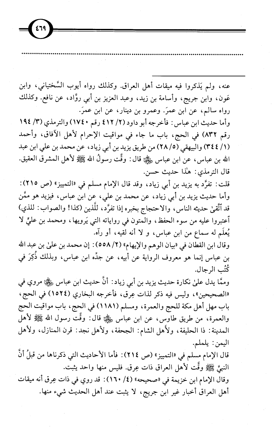 وممَّا يدل على نكارة حديث يزيد بن أبي زياد: أنَّ حديث ابن عباس -رضي الله عنهما- مروي في «الصحيحين «، وليس فيه ذكر لذات عِرق، فأخرجه البخاري (1524) في الحج، باب مهل أهل مكة للحج والعمرة، ومسلم (1181) في الحج، باب مواقيت الحج والعمرة، من طريق طاوس، عن ابن عباس -رضي الله عنهما- قال: وقَّت رسول الله صلى الله عليه وسلم لأهل المدينة: ذا الحليفة، ولأَهل الشام: الجحفة، ولأهل نجد: قرن المنازل، ولأهل اليمن: يلملم.