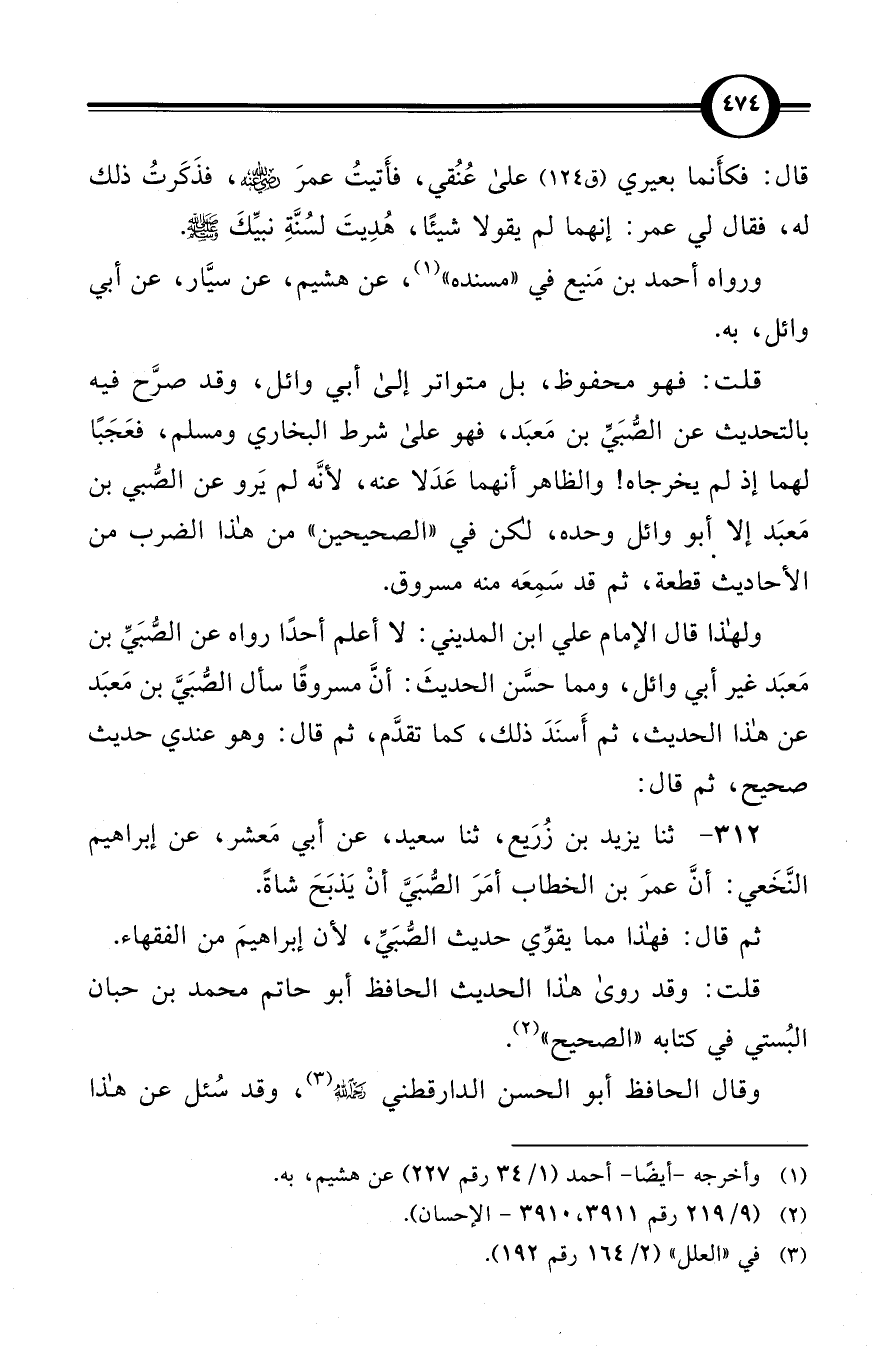 ولهذا قال الإمام علي ابن المديني: لا أعلم أحدًا رواه عن الصُّبَيِّ بن مَعبَد غير أبي وائل، ومما حسَّن الحديثَ: أنَّ مسروقًا سأل الصُّبَيَّ بن مَعبَد عن هذا الحديث، ثم أَسنَدَ ذلك، كما تقدَّم، ثم قال: وهو عندي حديث صحيح، ثم قال: