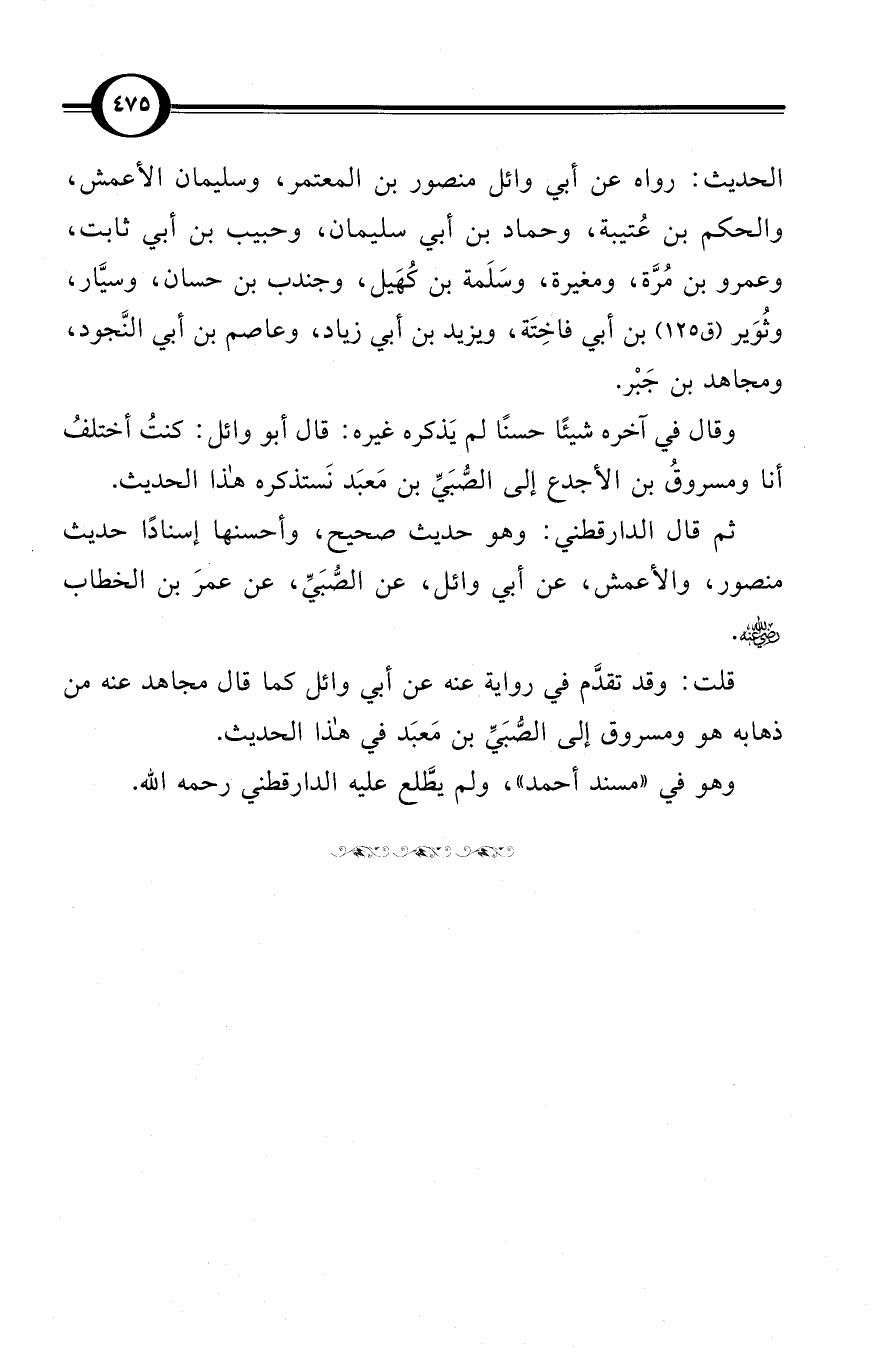 وقال في آخره شيئًا حسنًا لم يَذكره غيره: قال أبو وائل: كنتُ أختلفُ أنا ومسروقُ بن الأجدع إلى الصُّبَيِّ بن مَعبَد نَستذكره هذا الحديث.