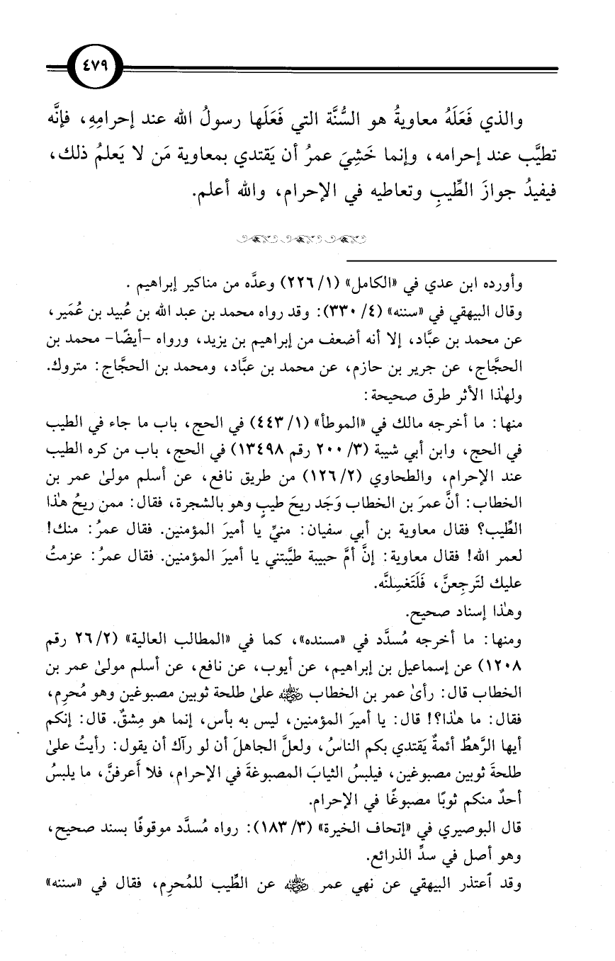 منها: ما أخرجه مالك في «الموطأ» (1/ 443) في الحج، باب ما جاء في الطيب في الحج، وابن أبي شيبة (3/ 200 رقم 13498) في الحج، باب من كره الطيب عند الإحرام، والطحاوي (2/ 126) من طريق نافع، عن أسلم مولى عمر بن الخطاب: أنَّ عمرَ بن الخطاب وَجَد ريحَ طيبٍ وهو بالشجرة، فقال: ممن ريحُ هذا الطِّيب؟ فقال معاوية بن أبي سفيان: منيِّ يا أميرَ المؤمنين. فقال عمرُ: منك! لعمر الله! فقال معاوية: إنَّ أمَّ حبيبة طيَّبتني يا أميرَ المؤمنين. فقال عمرُ: عزمتُ عليك لتَرجِعنَّ، فَلَتَغسِلنَّه.