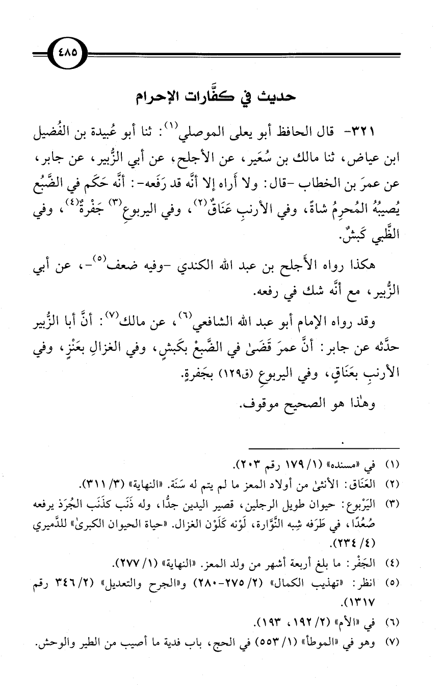(321) قال الحافظ أبو يعلى الموصلي (¬1): ثنا أبو عُبيدة بن الفُضيل بن عياض، ثنا مالك بن سُعَير، عن الأجلح، عن أبي الزُّبير، عن جابر، عن عمرَ بن الخطاب -قال: ولا أَراه إلا أنَّه قد رَفَعه-: أنَّه حَكَم في الضَّبُع يُصيبُهُ المُحرِمُ شاةً، وفي الأرنبِ عَنَاقٌ (¬2)، وفي اليربوعِ (¬3) جَفْرةٌ (¬4)، وفي الظَّبي كَبشٌ.