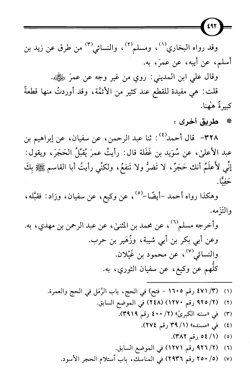 (328) قال أحمد (¬4): ثنا عبد الرحمن، عن سفيان، عن إبراهيم بن عبد الأعلى، عن سُوَيد بن غَفَلة قال: رأيتُ عمرَ يُقبِّلُ الحَجَرَ، ويقول: إنِّي لأَعلَمُ أنك حَجَرٌ، لا تَضرُّ ولا تَنفعُ، ولكنِّي رأيتُ أبا القاسم صلى الله عليه وسلم بِكَ حَفِيًّا.