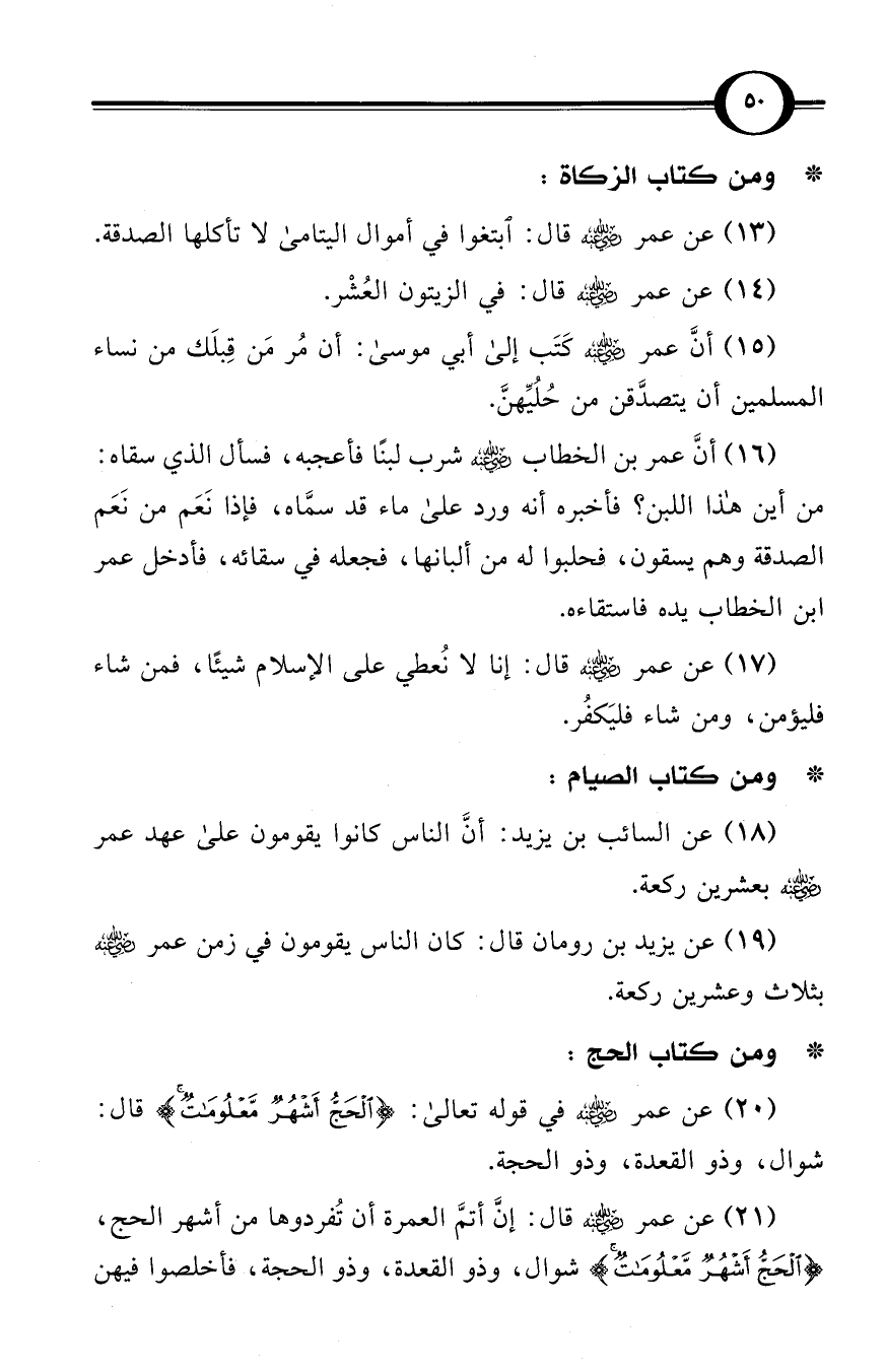 (21) عن عمر -رضي الله عنه- قال: إنَّ أتمَّ العمرة أن تُفردوها من أشهر الحج، {الحج أشهر معلومات} شوال، وذو القعدة، وذو الحجة، فأخلصوا فيهن