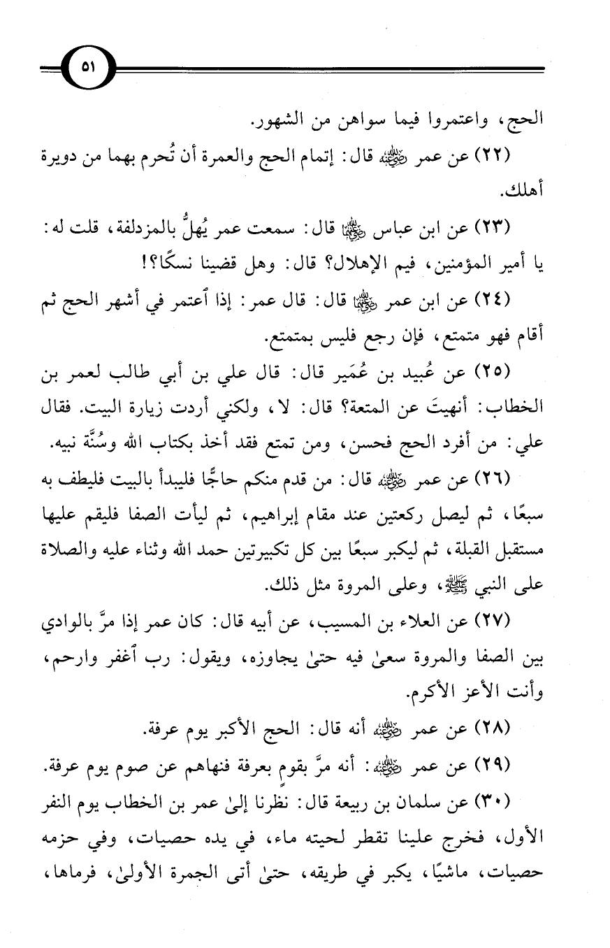 (30) عن سلمان بن ربيعة قال: نظرنا إلى عمر بن الخطاب يوم النفر الأول، فخرج علينا تقطر لحيته ماء، في يده حصيات، وفي حزمه حصيات، ماشيًا، يكبر في طريقه، حتى أتى الجمرة الأولى، فرماها،