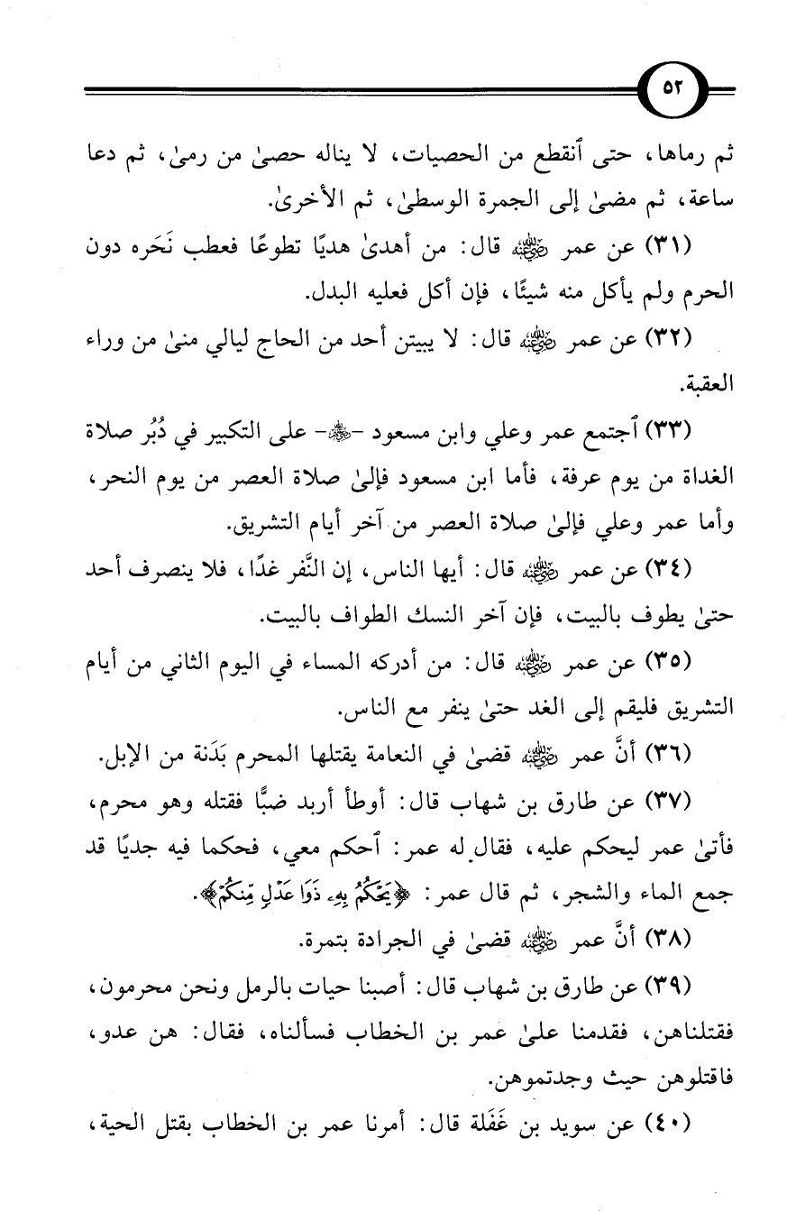 (39) عن طارق بن شهاب قال: أصبنا حيات بالرمل ونحن محرمون، فقتلناهن، فقدمنا على عمر بن الخطاب فسألناه، فقال: هن عدو، فاقتلوهن حيث وجدتموهن.