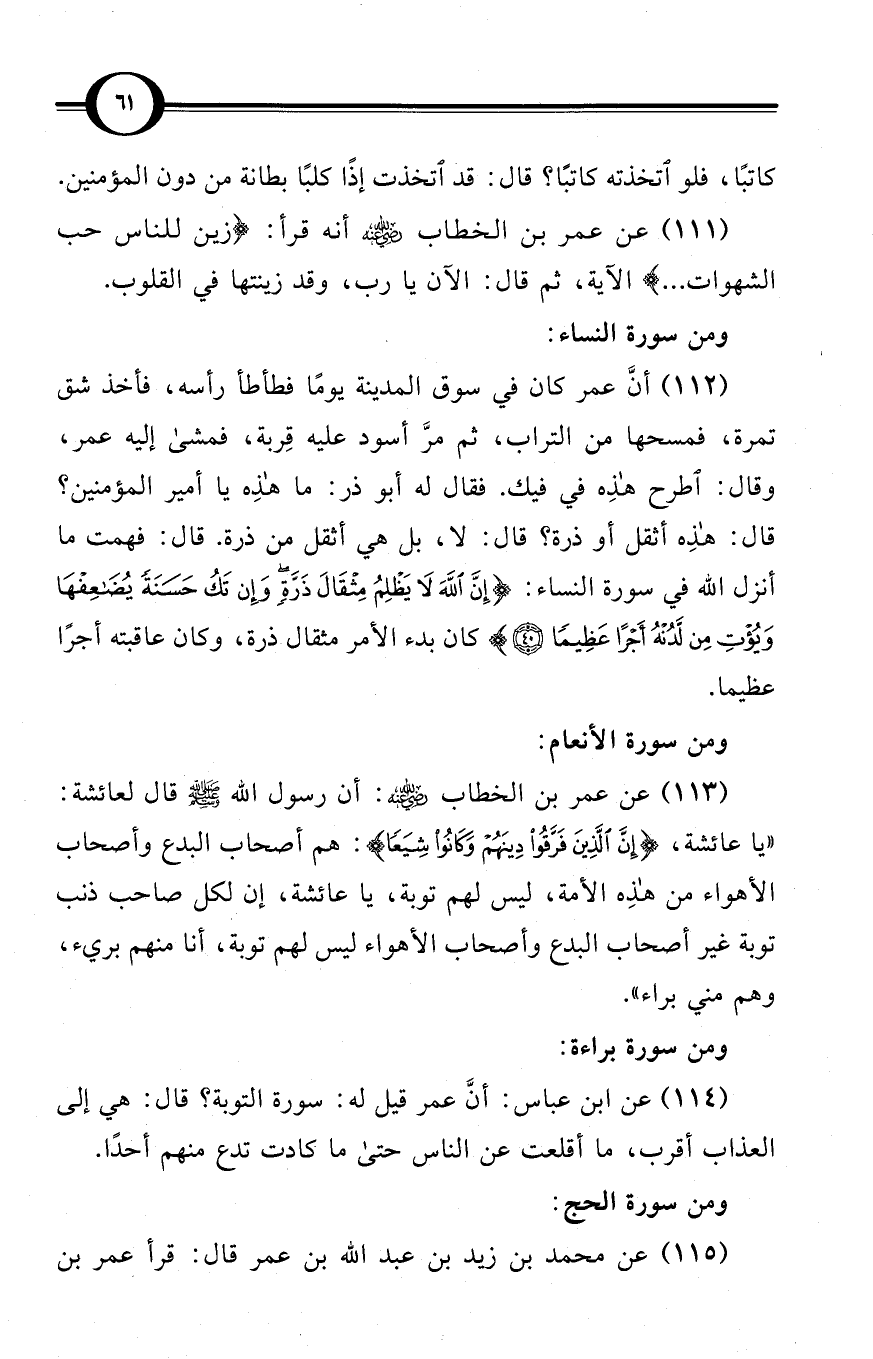 (112) أنَّ عمر كان في سوق المدينة يومًا فطأطأ رأسه، فأخذ شق تمرة، فمسحها من التراب، ثم مرَّ أسود عليه قِربة، فمشى إليه عمر، وقال: اطرح هذه في فيك. فقال له أبو ذر: ما هذه يا أمير المؤمنين؟ قال: هذه أثقل أو ذرة؟ قال: لا، بل هي أثقل من ذرة. قال: فهمت ما أنزل الله في سورة النساء: {إن الله لا يظلم مثقال ذرة وإن تك حسنة يضاعفها ويؤت من لدنه أجرا عظيما} كان بدء الأمر مثقال ذرة، وكان عاقبته أجرًا عظيما.