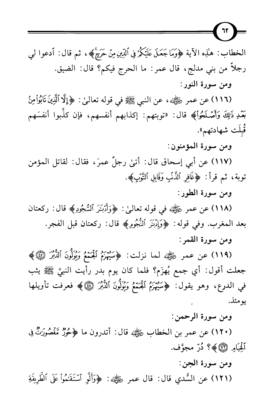 (118) عن عمر -رضي الله عنه- في قوله تعالى: {وأدبار السجود} قال: ركعتان بعد المغرب. وفي قوله: {وإدبار النجوم} قال: ركعتان قبل الفجر.