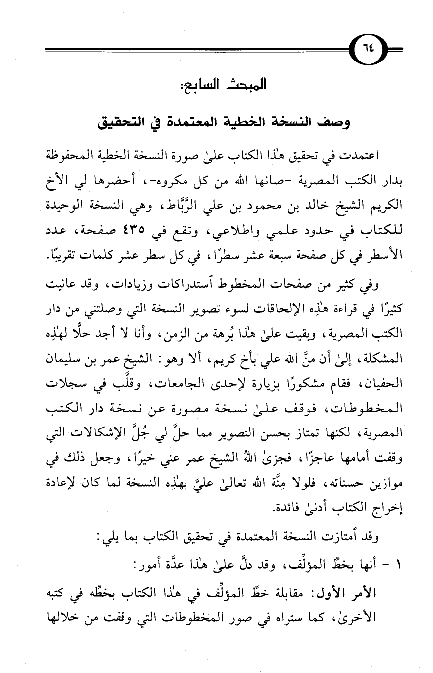 وقد امتازت النسخة المعتمدة في تحقيق الكتاب بما يلي: