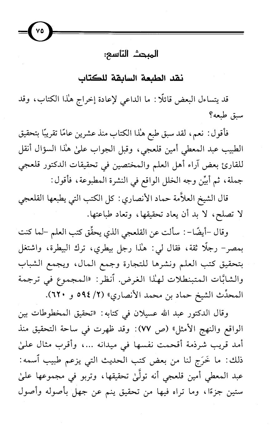قال الشيخ العلاَّمة حماد الأنصاري: كل الكتب التي يطبعها القلعجي لاتصلح، لابد أن يعاد تحقيقها، وتعاد طباعتها.