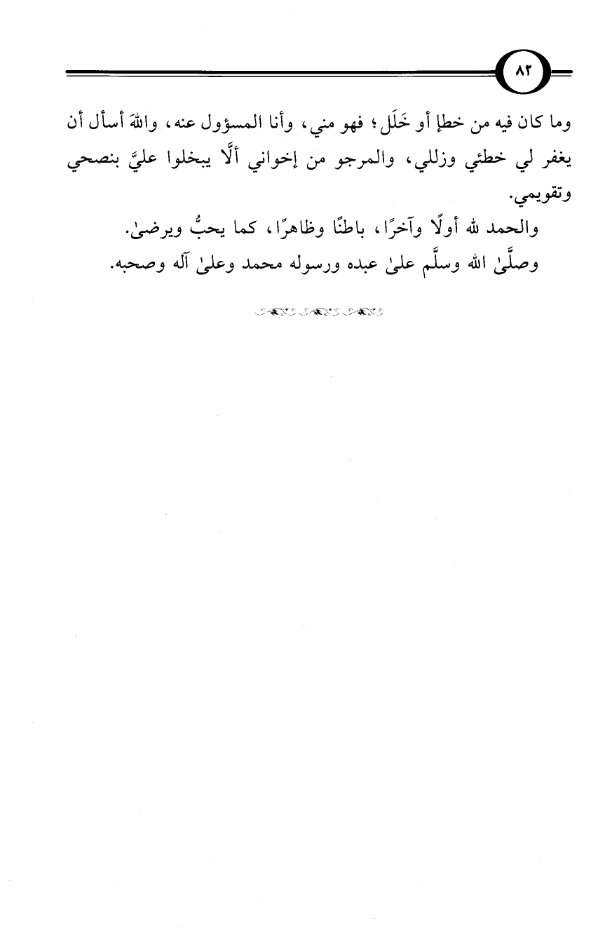 وما كان فيه من خطإ أو خَلَل؛ فهو مني، وأنا المسئول عنه، واللهَ أسأل أن يغفر لي خطئي وزللي، والمرجو من إخواني ألا يبخلوا عليَّ بنصحي وتقويمي.
