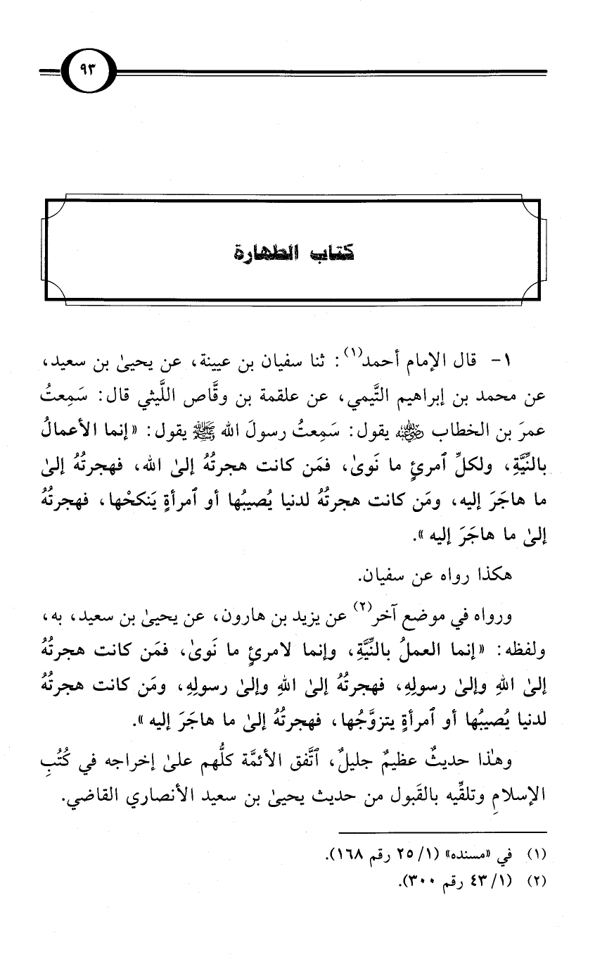 (1) قال الإمام أحمد (¬1): ثنا سفيان بن عيينة، عن يحيى بن سعيد، عن محمد بن إبراهيم التَّيمي، عن علقمة بن وقَّاص اللَّيثي قال: سَمِعتُ عمرَ بن الخطاب -رضي الله عنه- يقول: سَمِعتُ رسولَ الله صلى الله عليه وسلم يقول: «إنما الأعمالُ بالنِّيَّةِ، ولكلِّ امرئٍ ما نَوَى، فمَن كانت هجرتُهُ إلى اللهِ، فهجرتُهُ إلى ما هاجَرَ إليه، ومَن كانت هجرتُهُ لدنيا يُصيبُها أو امرأةٍ يَنكحُها، فهجرتُهُ إلى ما هاجَرَ إليه».