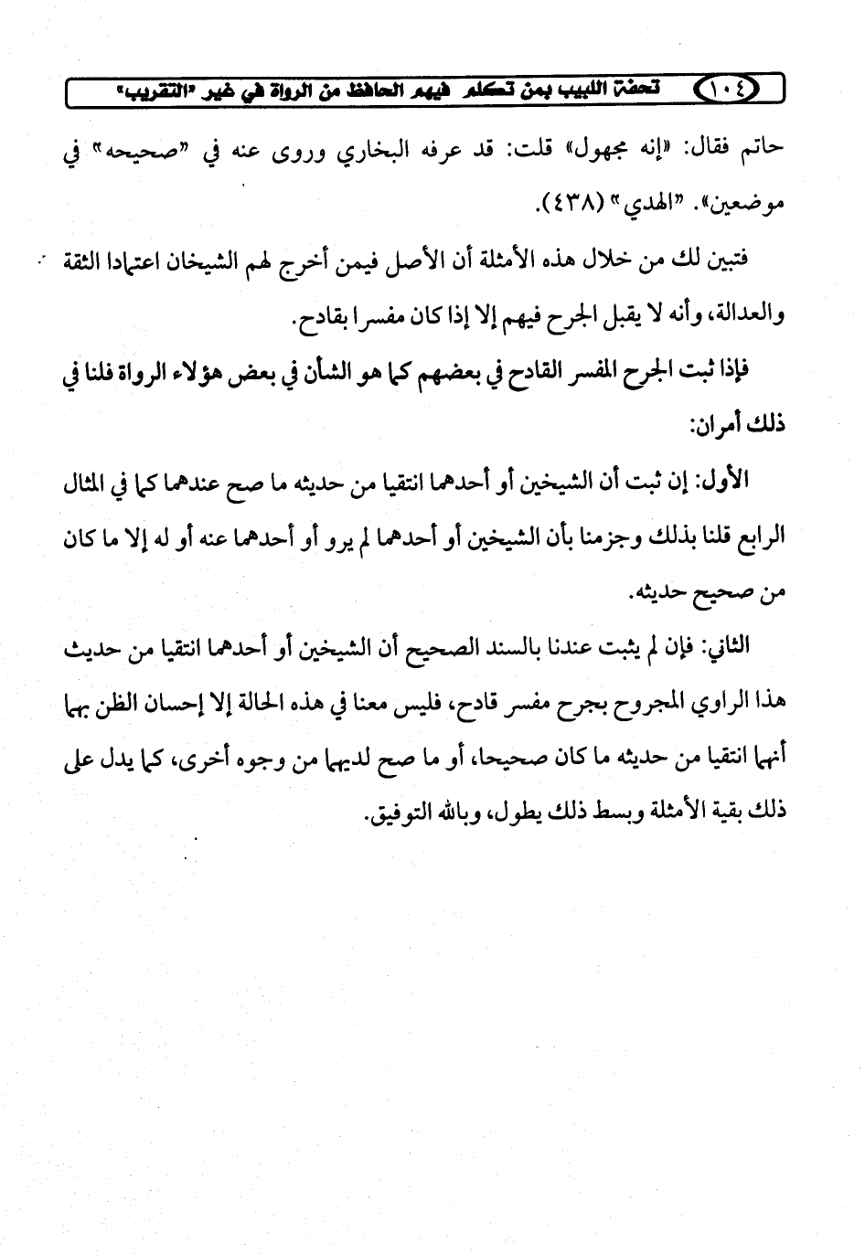 الثاني: فإن لم يثبت عندنا بالسند الصحيح أن الشيخين أو أحدهما انتقيا من حديث هذا الراوي المجروح بجرح مفسر قادح، فليس معنا في هذه الحالة إلا إحسان الظن بهما أنهما انتقيا من حديثه ما كان صحيحا، أو ما صح لديهما من وجوه أخرى، كما يدل على ذلك بقية الأمثلة وبسط ذلك يطول، وبالله التوفيق.