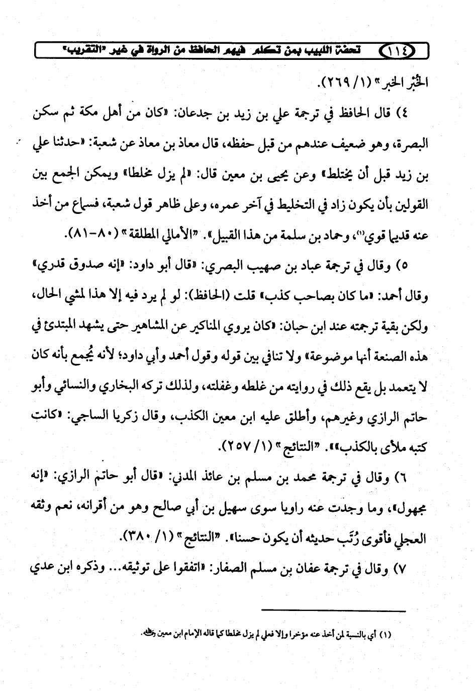5) وقال في ترجمة عباد بن صهيب البصري: "قال أبو داود: "إنه صدوق قدري" وقال أحمد: "ما كان بصاحب كذب" قلت (الحافظ): لو لم يرد فيه إلا هذا لمشي الحال، ولكن بقية ترجمته عند ابن حبان: "كان يروي المناكير عن المشاهير حتى يشهد المبتدئ في هذه الصنعة أنها موضوعة" ولا تنافي بين قوله وقول أحمد وأبي داود؛ لأنه يُجمع بأنه كان لا يتعمد بل يقع ذلك في روايته من غلطه وغفلته، ولذلك تركه البخاري والنسائي وأبو حاتم الرازي وغيرهم، وأطلق عليه ابن معين الكذب، وقال زكريا الساجي: "كانت كتبه ملأى بالكذب". "النتائج" (1/ 257).